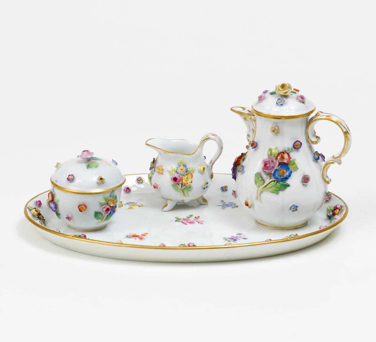 Porzellan, farbig und gold staffiert. Insg. 4 Teile best. aus Tablett, Mokkakanne,Zuckerdose, Milchkännchen. Zustand B.