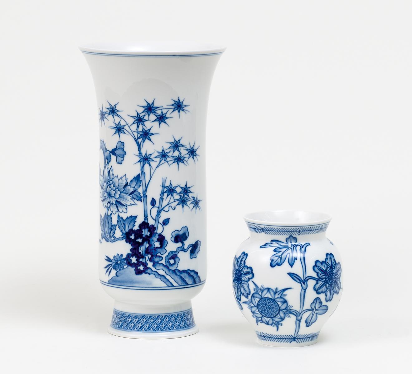 Porzellan, blaues Unterglasurdekor. H.15,5 und 34,5cm. Zustand A.