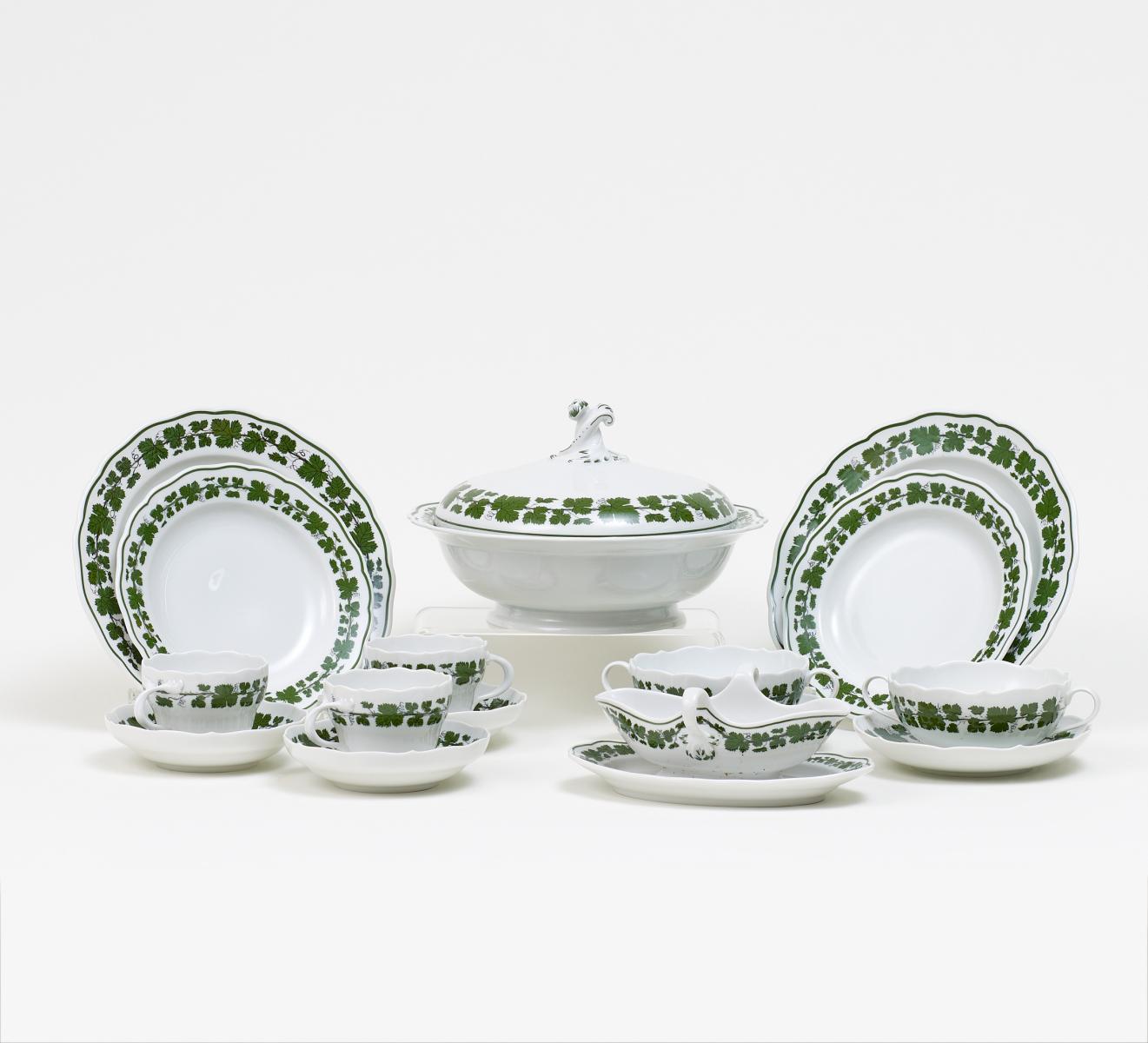Porzellan, grünes Dekor. Insg. 46 Teile best. aus 12 Speisetellern, 11 Kuchentellern, 6 Kaffeetassen, 6 Kaffee-UT,