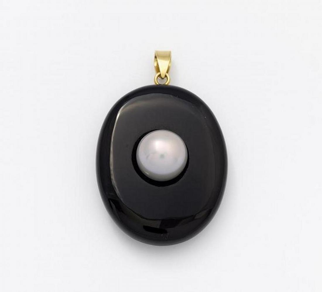 Medaillon mit Onyx-Zuchtperlbesatz.