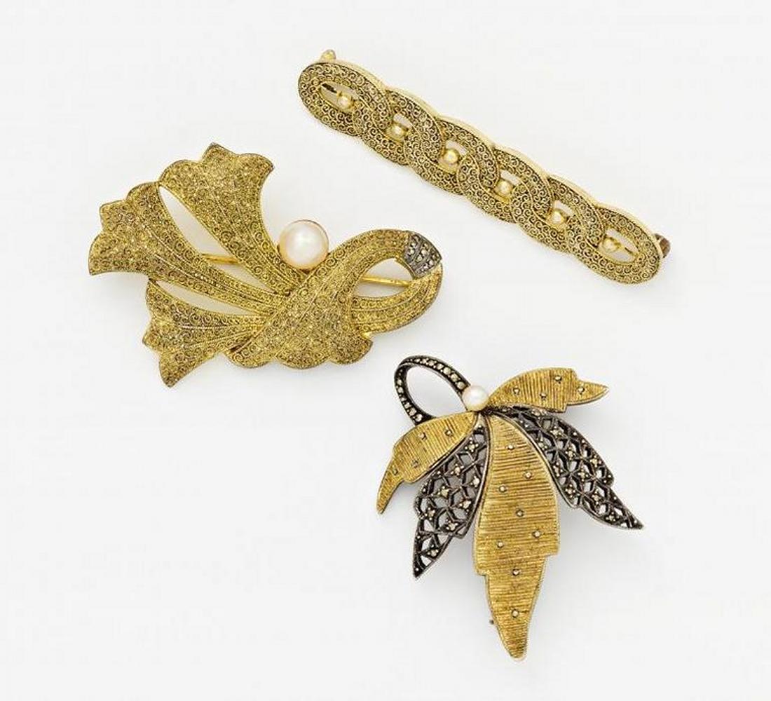 925/- Silber, gestempelt/vergoldet. 29,5g. ca. 56 Markasite, 2 Süßwasser-Zuchtperlen, weiß-rose, D.ca. 7,2 - 4,0mm. Stabnadel: L. 6,2cm, Ahornblatt: ca. 4,8 x 3,8cm, Geschwungene Brosche: ca. 5,3 x 3,0cm.~ Rückseitig gestempelt ORIGINAL FAHRNER, TF.