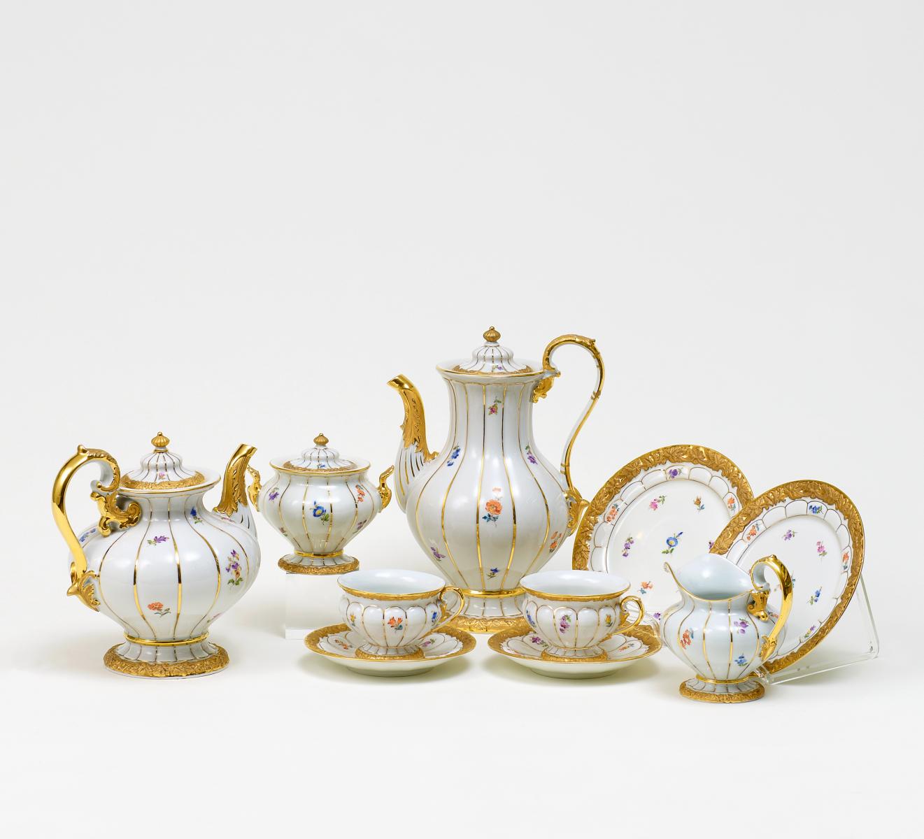 Porzellan, farbig und gold staffiert. 6 Personen. Insg. 22 Teile, best. aus 6 Tellern, 6 Tassen, 6 UT, Kaffeekanne, Teekanne,