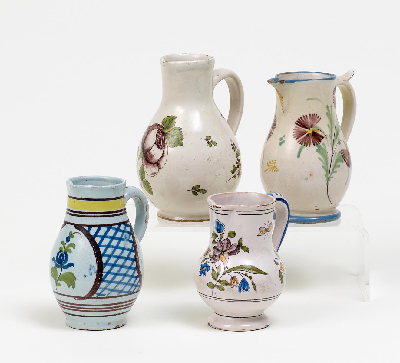 Sandfarbener Scherben, weiß glasiert, farbiges Dekor. H.11cm/12,5cm/13cm/14,5cm. Zustand B.
