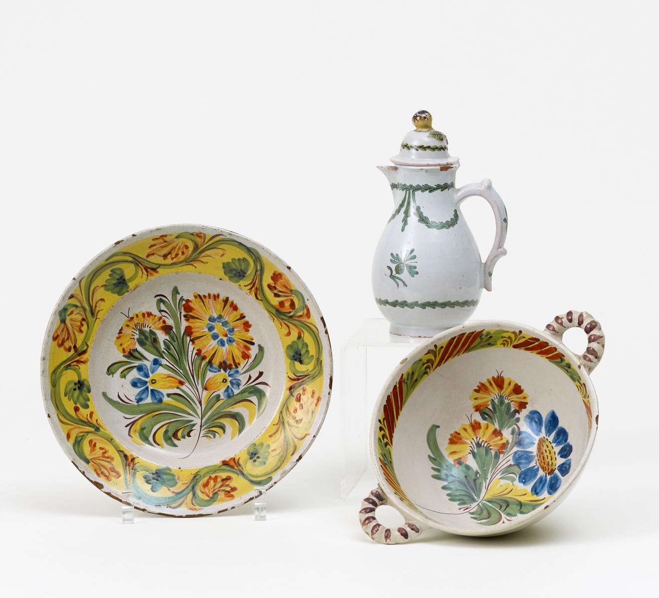 Beiger Scherben, weiße Glasur, farbiges Dekor. H.20,5 / H.10, + 27,5 / + 26cm. Zustand B-C.