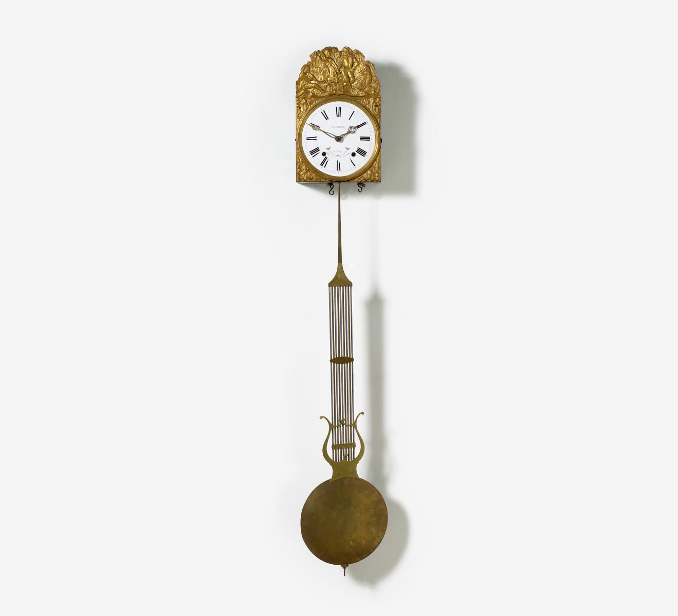 Eisen. Geprägtes Messing. Emailzifferblatt. Lyrapendel. H.44cm. Zustand C.