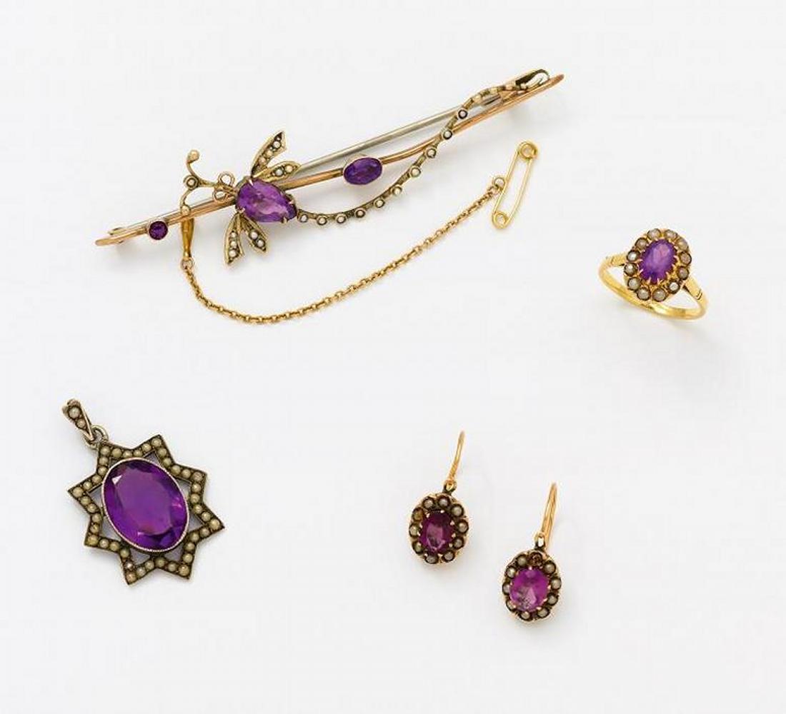 Goldfarben, 935/- Silber, gest.; Goldfarben/silbern; Goldfarben. 2,0g; 3,1g; 5,0g; 2,1g. 4 oval facettierte Amethyste, 1 ovaler facettierter Glasstein, 1 rund facettierter Amethyst, 1 Amethyst-Tropfen, 104 Saatperlen (eine fehlend), EU-RM: 49. Brosche: L. 7,5cm; Ohrgehänge: H. 1,8cm; Anhänger: 3,2 x 2,1cm.~