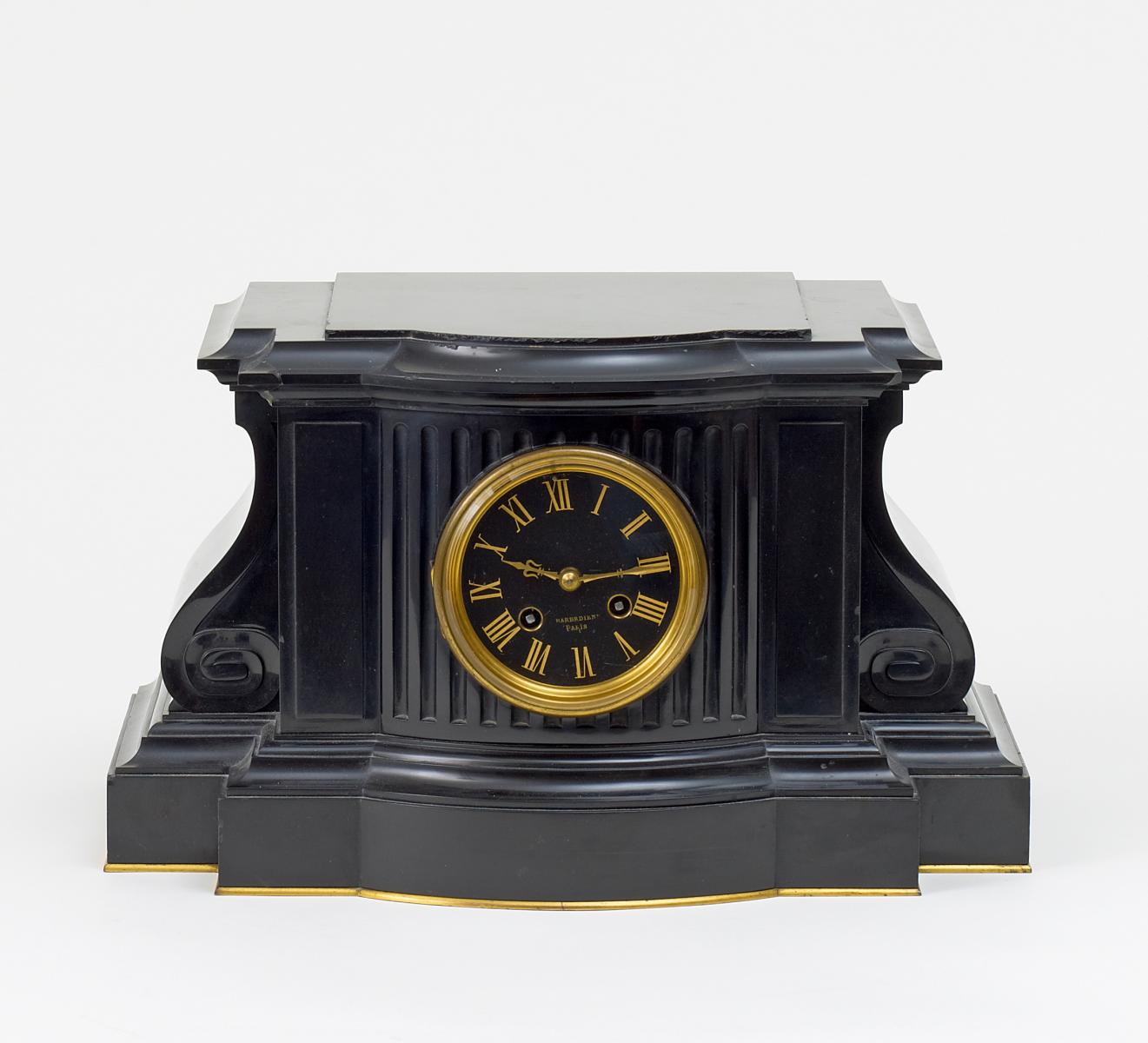 Schwarzer Marmor. Pendulenwerk mit Federaufhängung und Schlag auf Glocke. H.23,5cm. Zustand B.