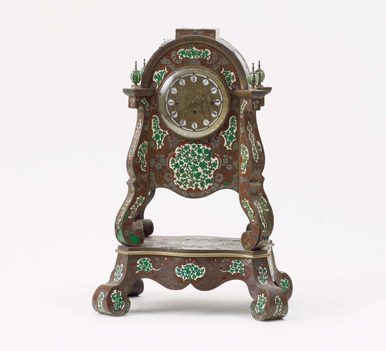 Boulle-Technik. Messing, Zinn und farbige Pasten ornamental eingelegt. Pendulenwerk mit Fadenaufhängung und Schlag auf Glocke. H. 51,5cm. Zustand C.