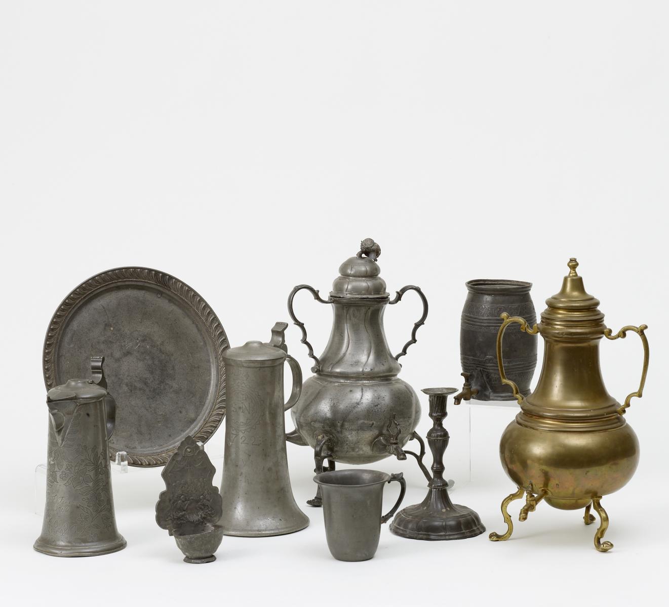 Zinn, Messing. 10 Teile. Bestehend aus: 2 Dröppelminnen, 2 Schenkkannen, Weihwasserbecken, Leuchter,