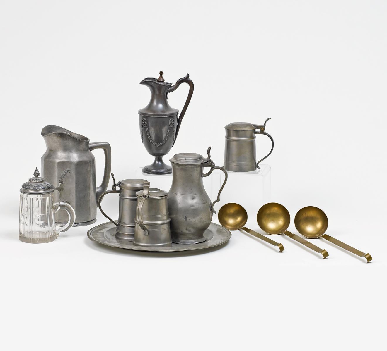 Zinn, Glas. Insg. acht Teile. {Beil.:} Drei Suppenkellen. Messing. H.18-28,5cm, + 38cm. Zustand B.