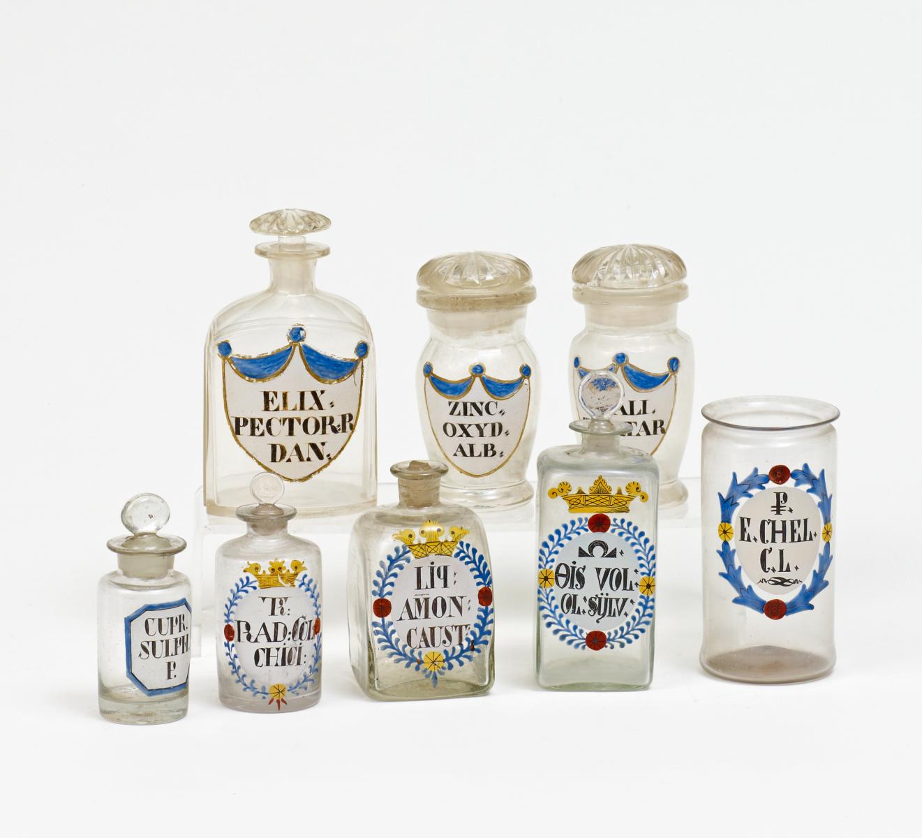 Glas, farbig bemalt und beschriftet. H.11,5-15,5cm. Zustand A/B-C.