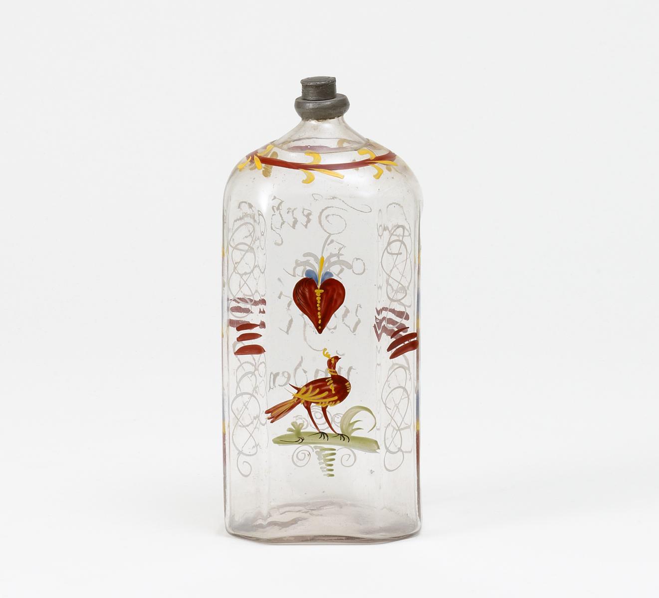 Farbloses Glas, farbiger Emaildekor. Zinnverschluss. H.25cm. Zustand A/B.