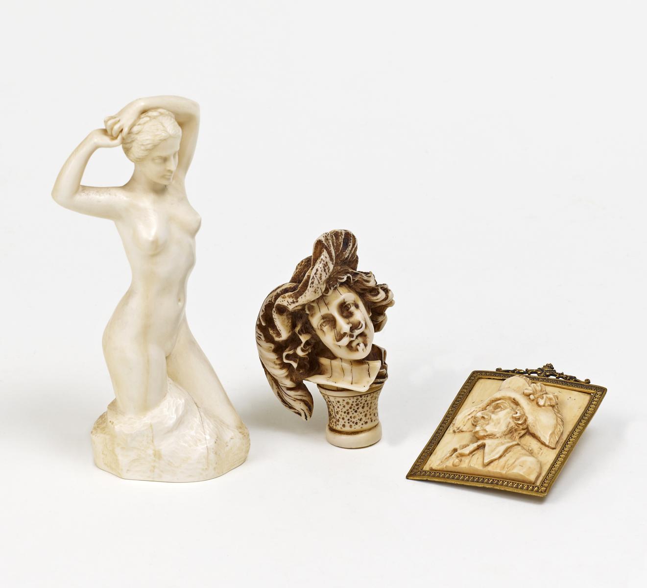 Bein, geschnitzt. Messingrahmen. {Beil.:} weibl. Akt und Büste. Mit Rahmen 8,5 x 6,5cm. Zustand A/B.