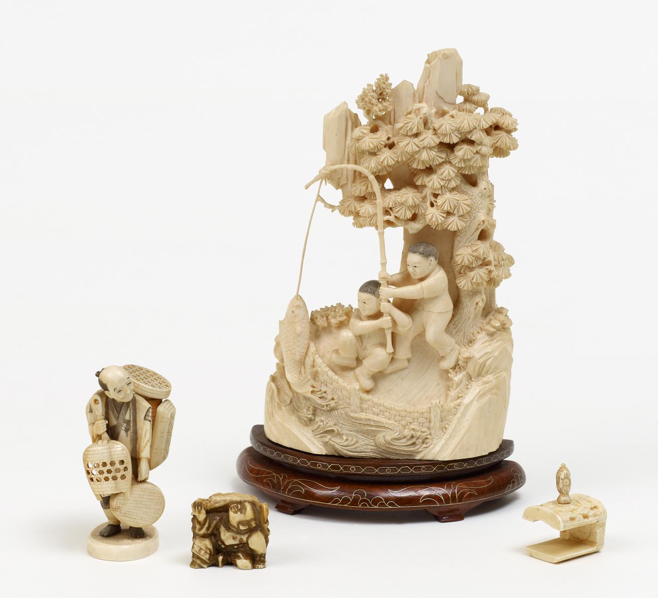 Bein, geschnitzt. Holzsockel. {Beil.:} 2 Figuren, Schraubklemme. H.23cm. Zustand A/B.