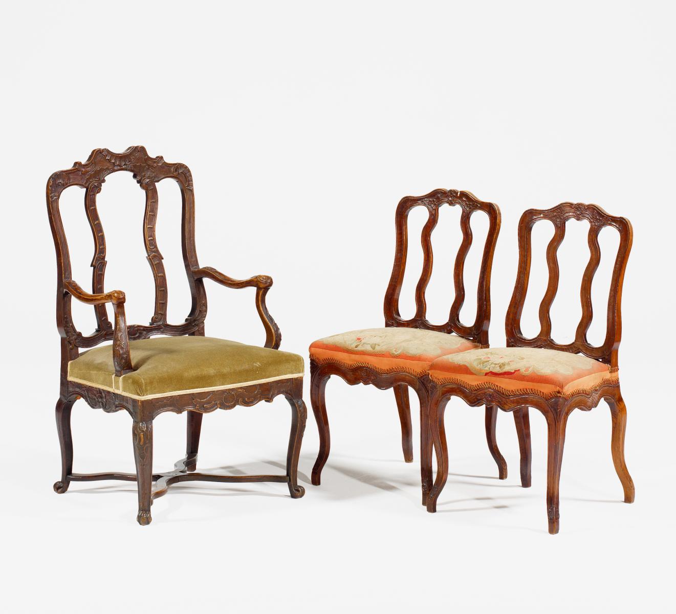 Eiche geschnitzt, gepolstert. beil.: 2 Barockstühle. H. 106cm. Zustand C.