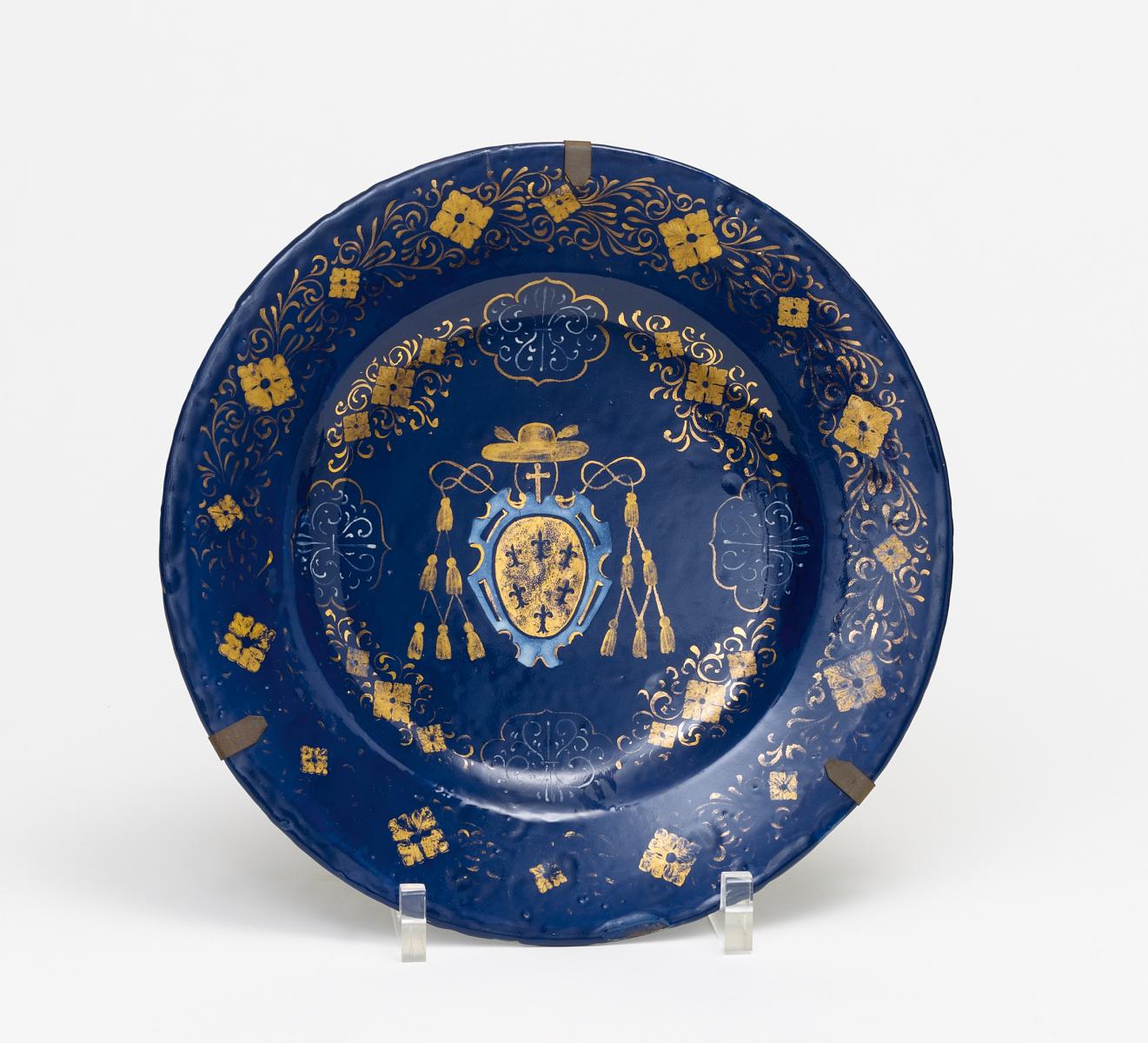 Keramik, blaue Glasur mit Dekor in Weiß und Gold. + 32cm. Zustand A/B.