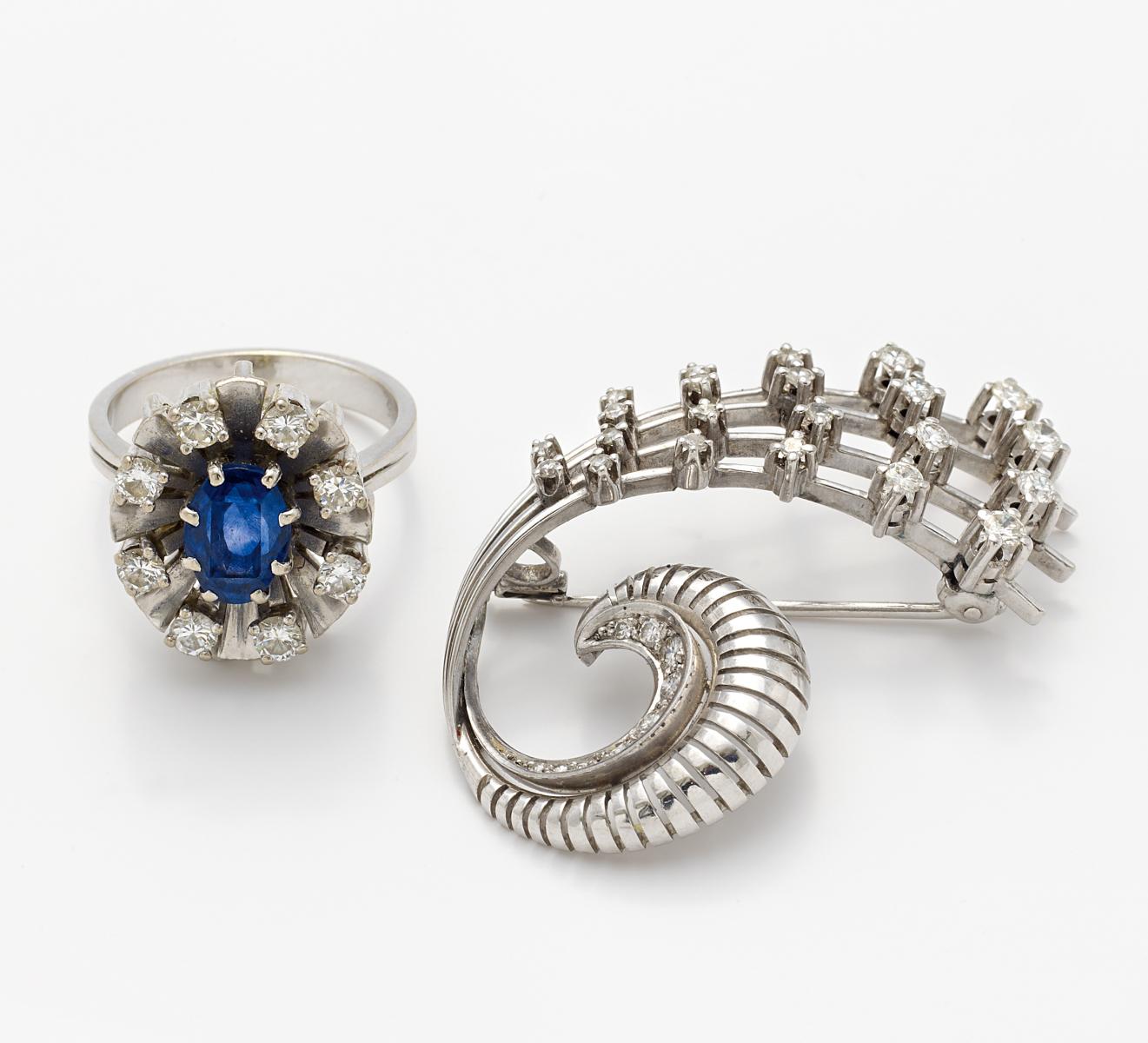 750/- und 585/- Weißgold, gestempelt. 11,2g, 8,0g. 1 oval facettierte Saphir-Synthese, ca. 39 Diamanten im Brillant- und 8/8-Schliff, EU-RM: 54,5. Ringtop: 1,8 x 1,6cm, Brosche: 4,5 x 2,4cm.~