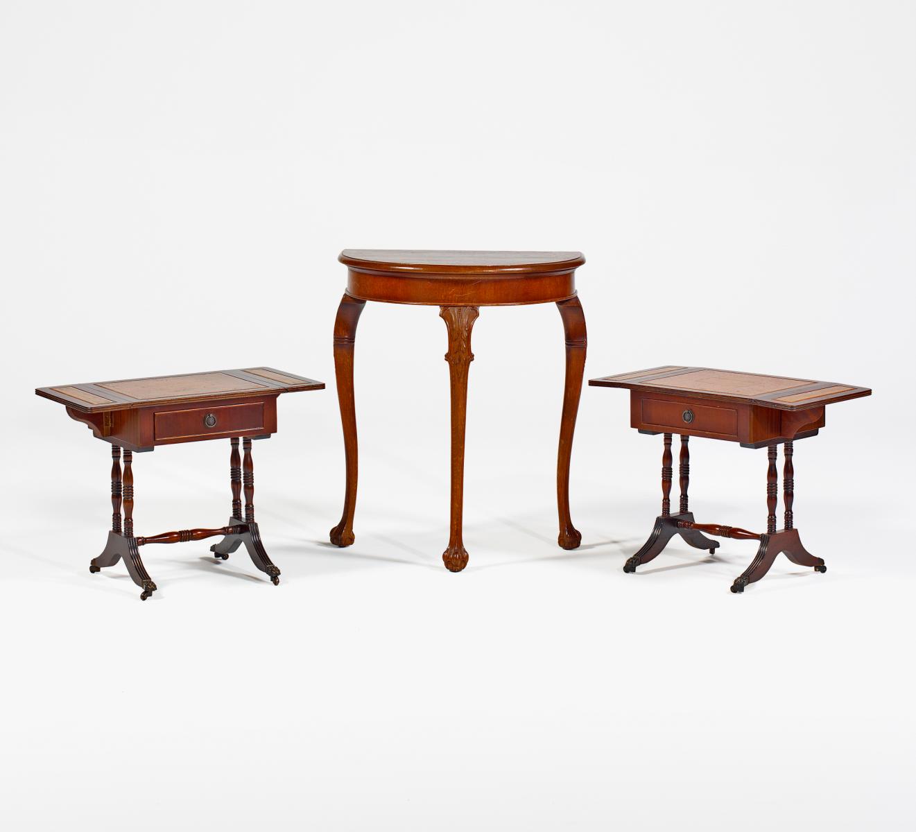 Mahagoni, Lederbespannung. {Beil.:} Kleine Konsole. 53x70x37cm. Zustand B/C.