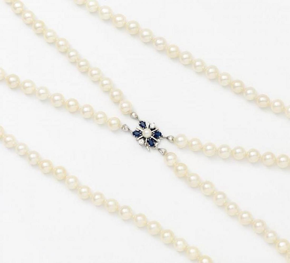 750/- Weißgold, gestempelt. 65,3g. 4 facettierte Saphir-Tropfen, 2 Brillanten, ca. 115 Süßwasser-Zuchtperlen zu zwei Strängen, creme-rose, D. ca. 8,0mm, 1 Süßwasser-Zuchtperle D. 5,0mm. L. 46,0-50,0cm.~