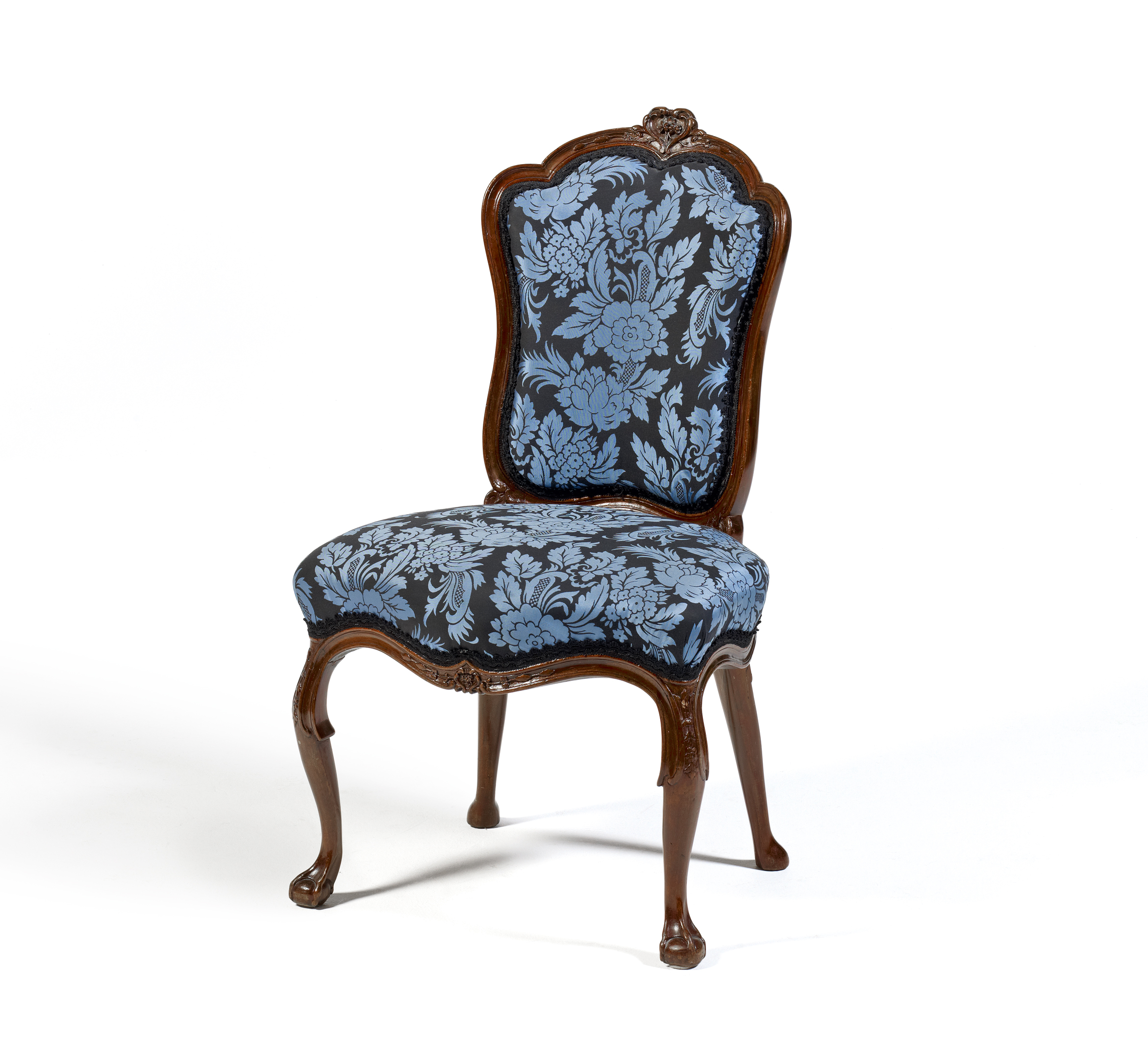 feinstes Rautenmosaik. Die Beschläge mit Rocaillen und Blattwerk. 89x130x65 cm.
