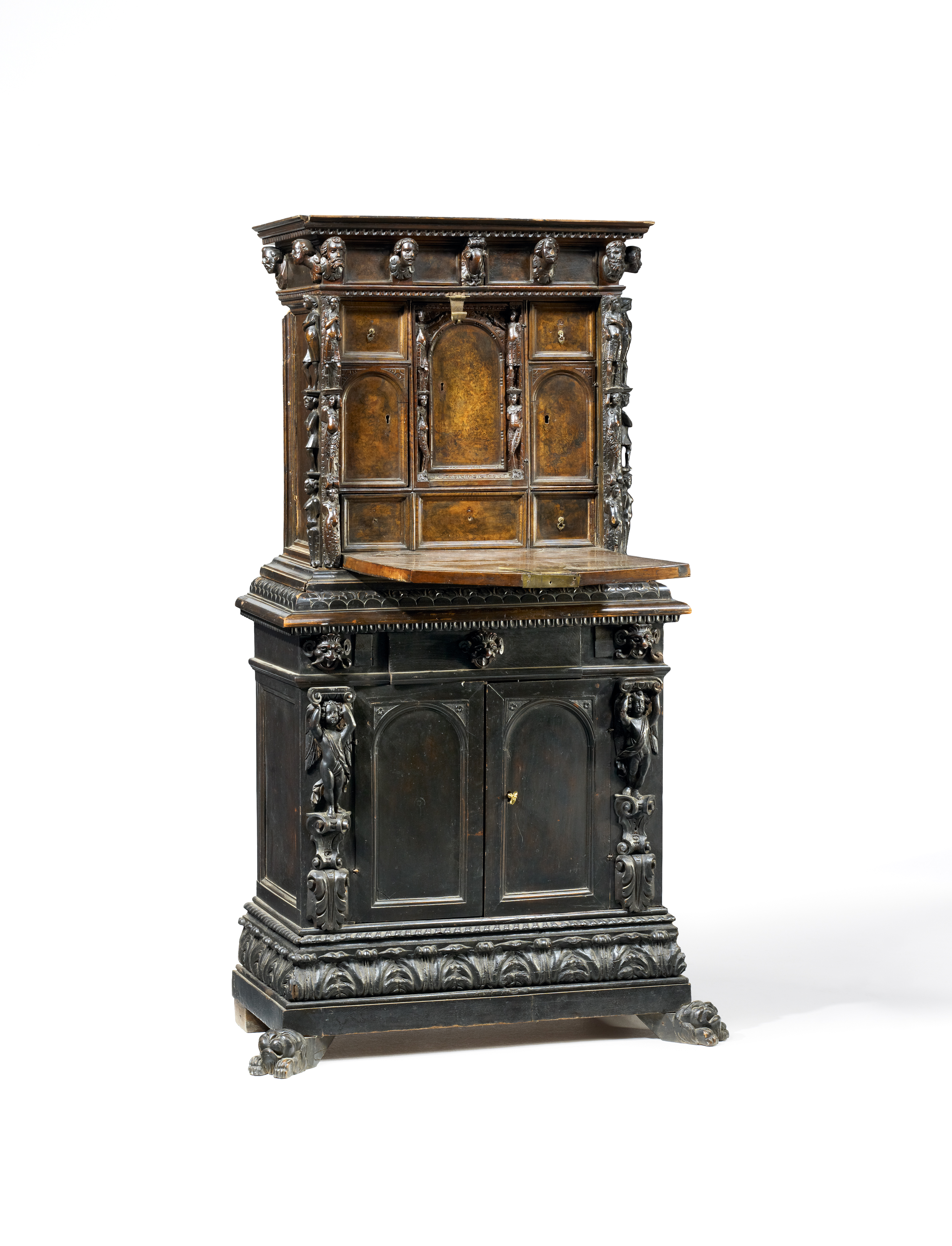 Nussbaum, poliert und tlw. geschnitzt, Nussbaummaser, schwarz gefärbt. Hochrechteckiger Korpus mit klappbarer Schreibplatte. An den Kanten Assistenzfiguren. Sims