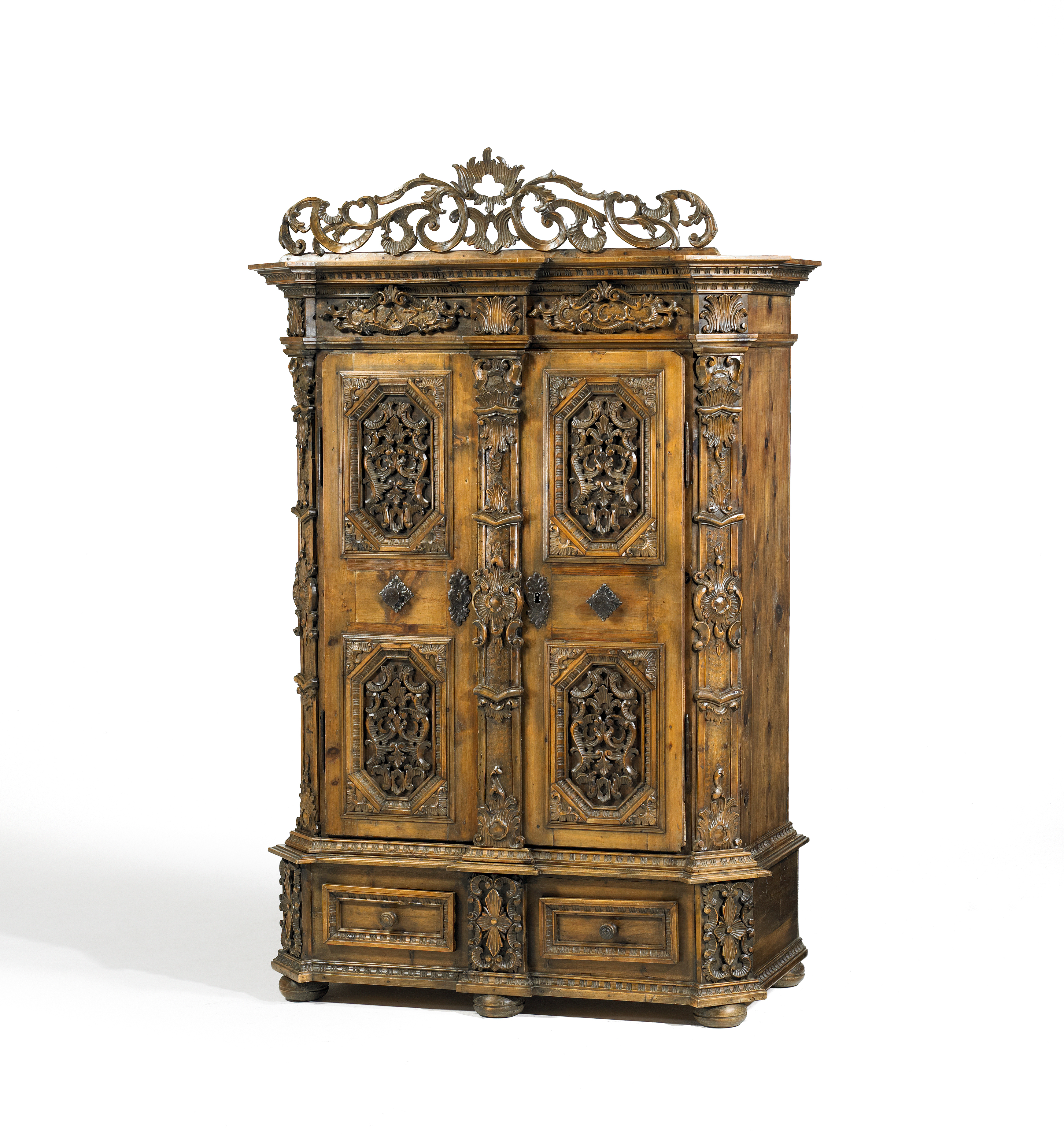 Zirbenholz geschnitzt. Eisenbeschläge. Sockelzone mit zwei Schüben. Darüber zweitüriger Korpus mit abgeschrägten Kanten. In
