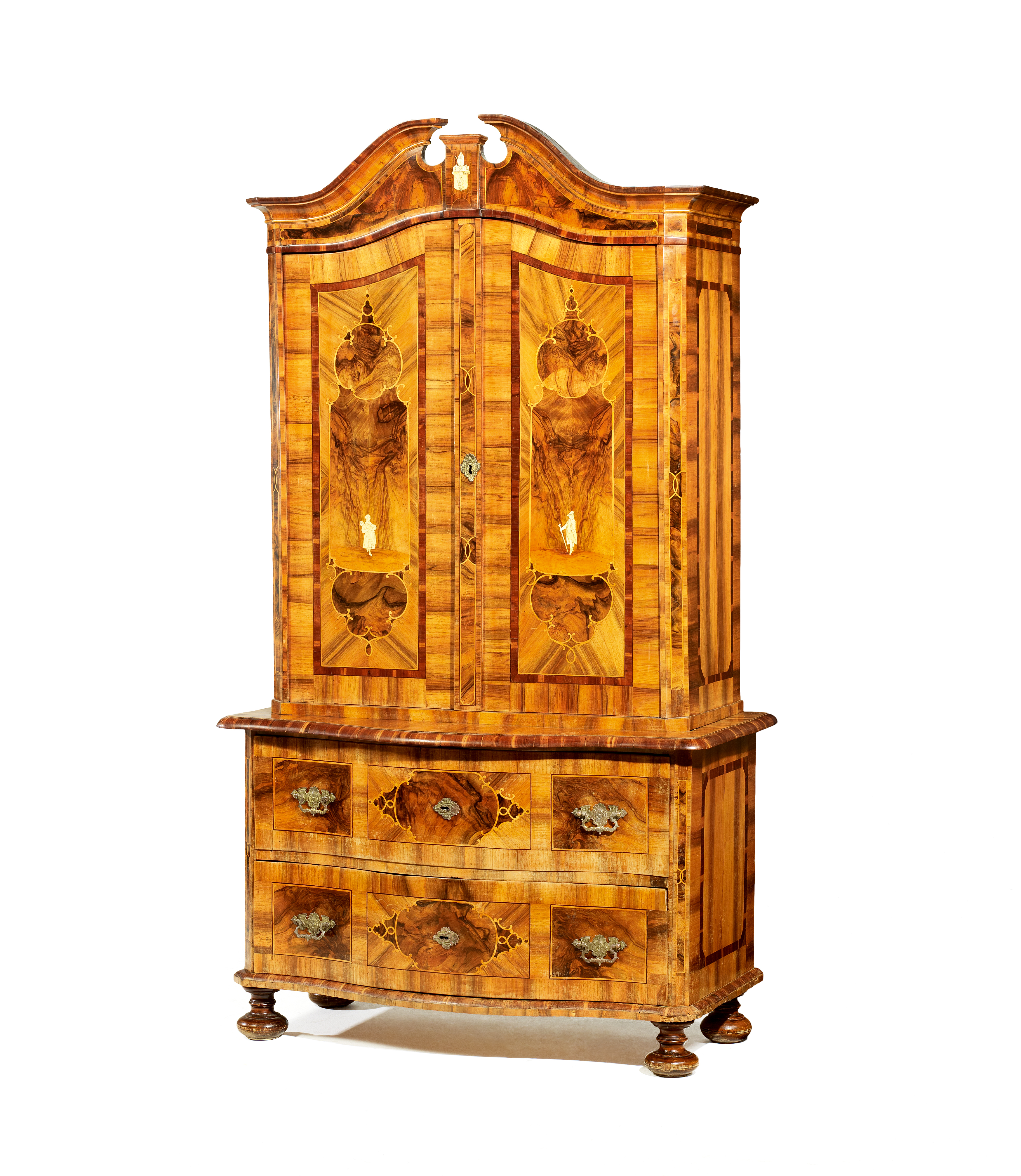 Nussbaum, Nussbaummaserholz, Pflaume, Ahorn und graviertes Elfenbein. Zweischübiges Kommodenunterteil mit geschwungener Front. Leicht zurückgesetzter