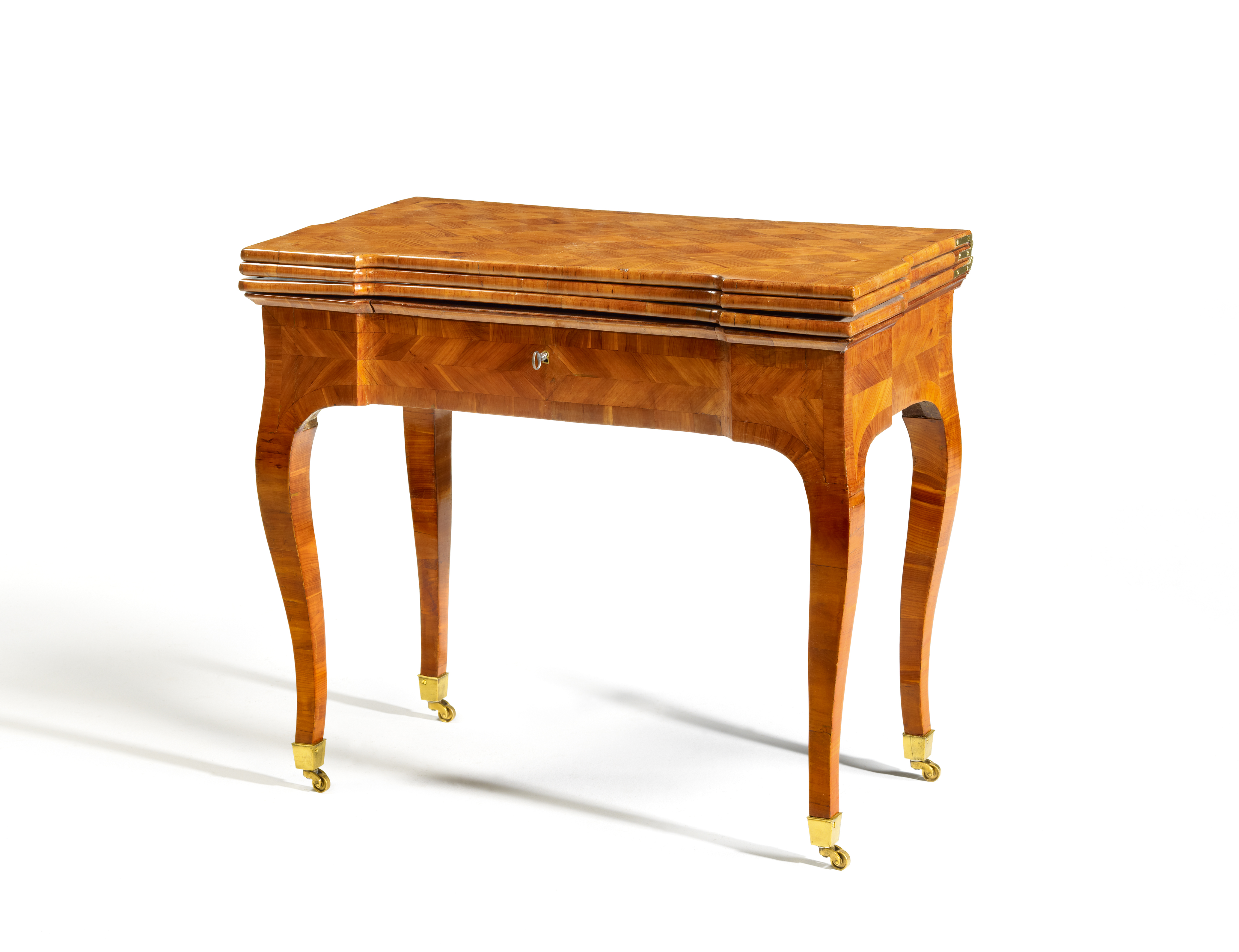 Eibe und andere Hölzer. Rechteckiger Korpus mit vier geschweiften Füßen auf Rollen. Dreifach klappbare Tischplatte