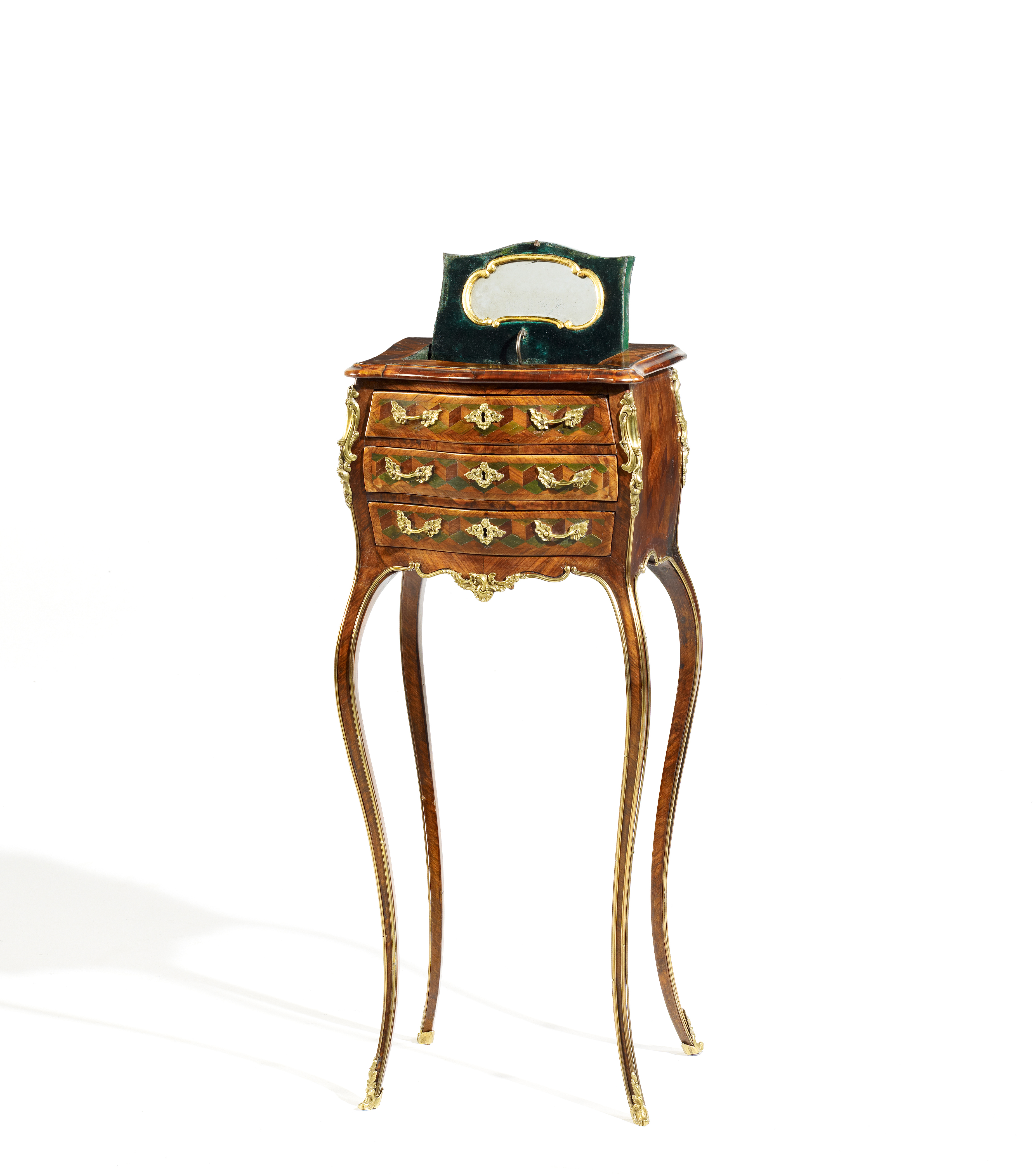 Königsholz, Holz tlw. grün gefärbt. Vergoldete Applikationen. Bombierter Korpus mit drei kleinen Schüben auf hohen zierlichen Beinen ruhend. Unter der