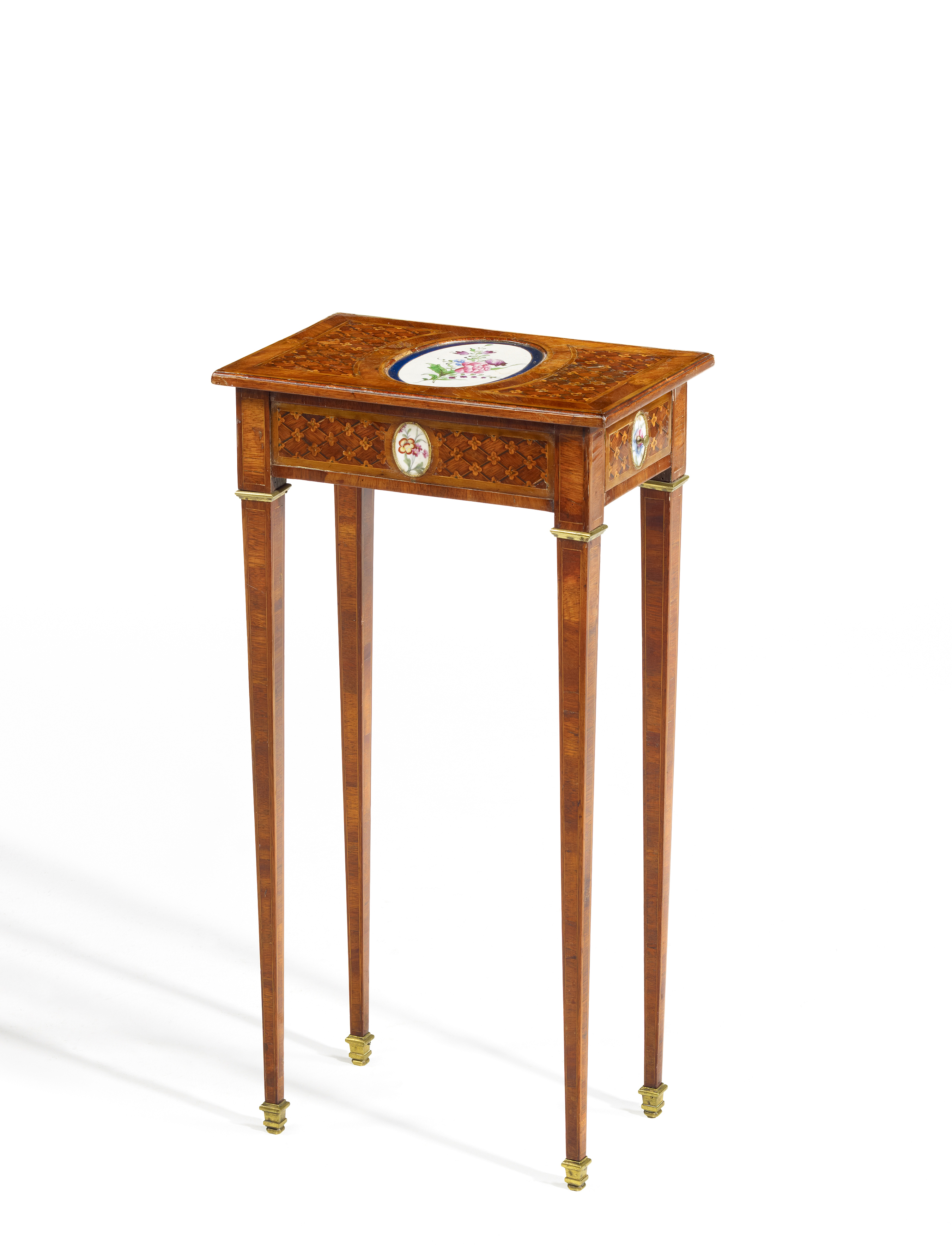 Nussbaum, Ahorn, Mahagoni und andere Hölzer, poliert und eingelegt. Porzellanplaketten. Rechteckiger Korpus auf hohen Spitzbeinen. Seitlich kleiner Schub bzw. herausziehbare