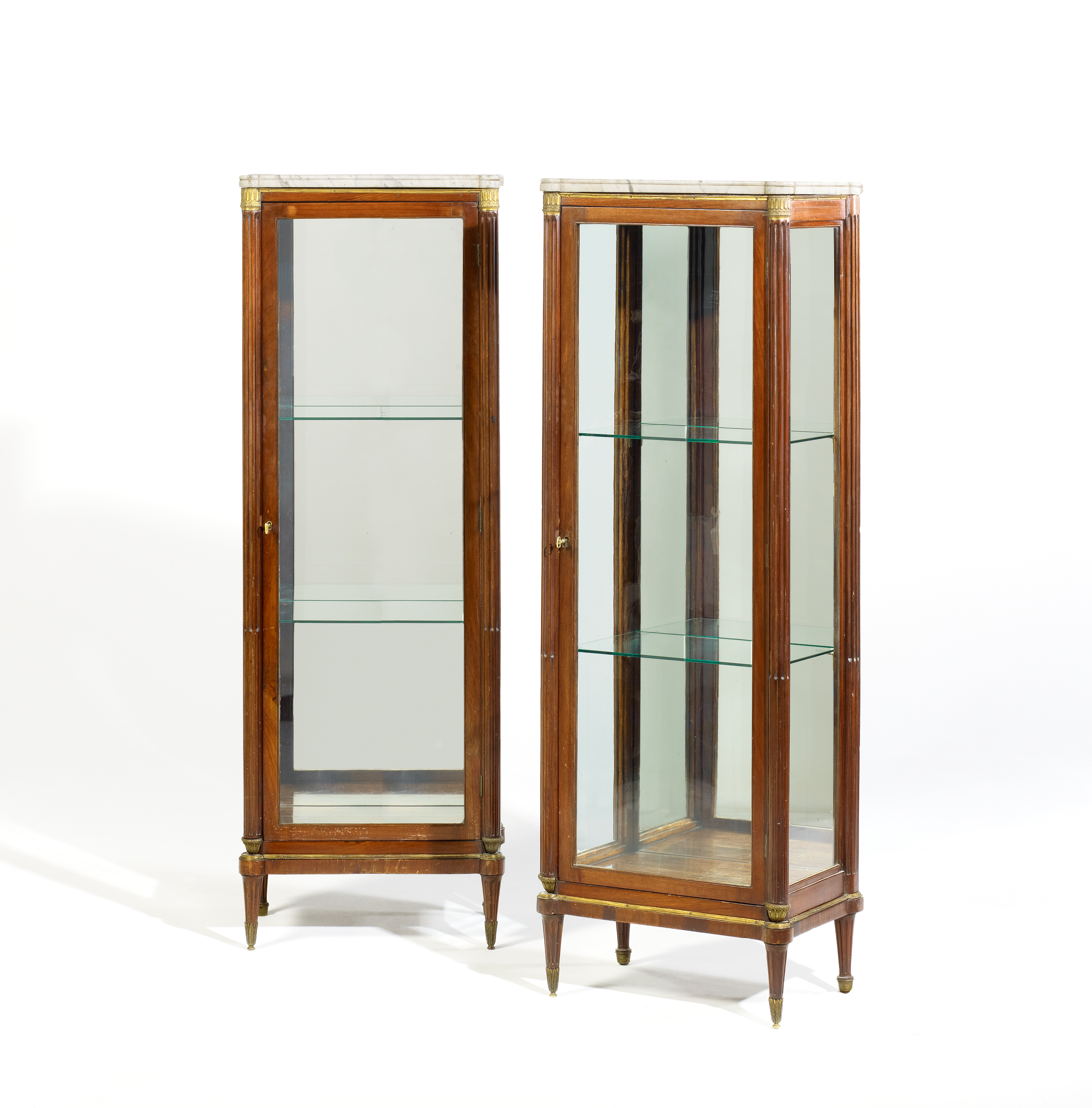 Mahagoni. Marmorplatte. Appllikationen. Schlanker, dreiseitig verglaster Korpus mit verspiegelter Rückwand. An den Kanten