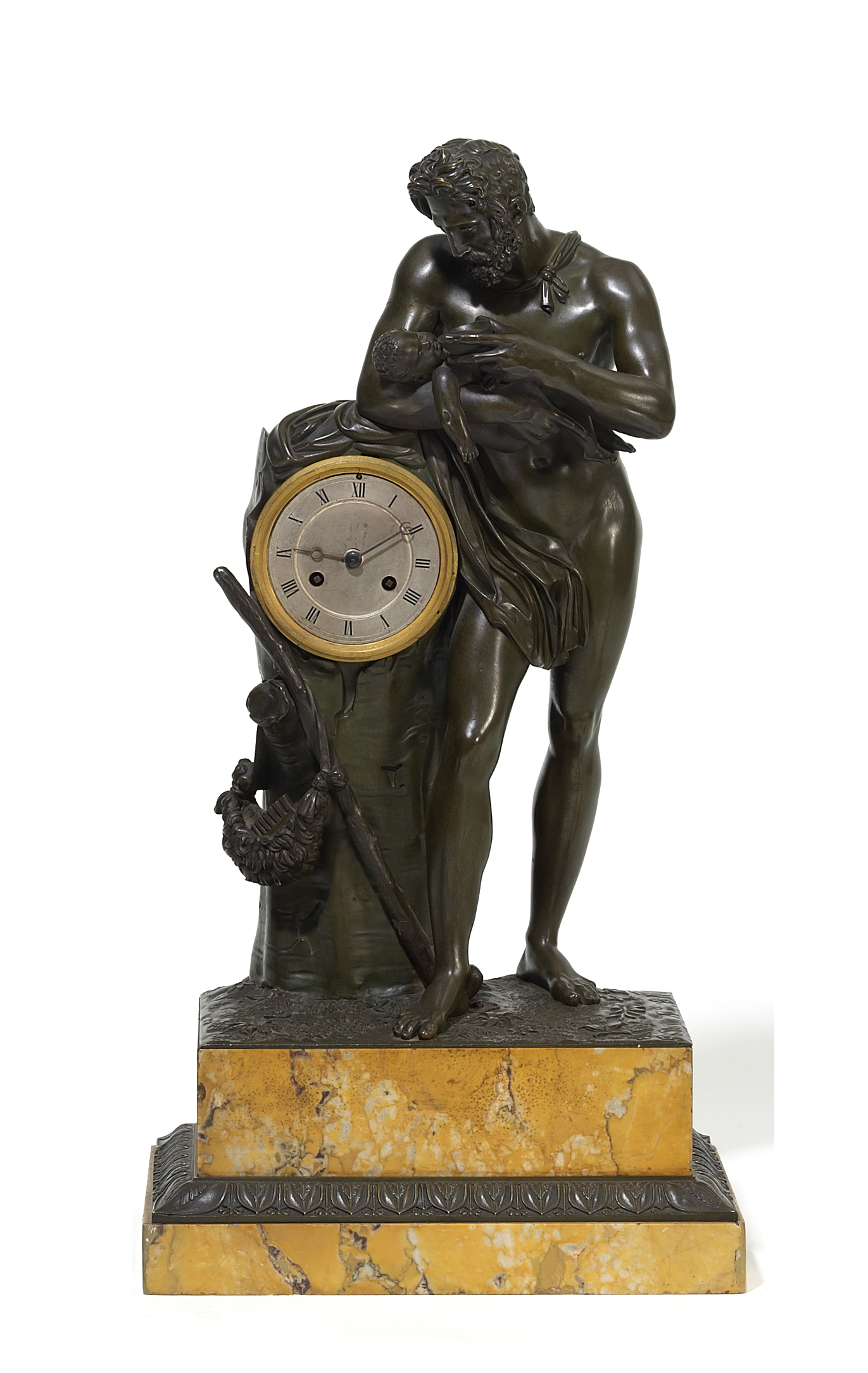 Beiger Marmor und patinierte Bronze. Auf gestuftem Sockel an einem Baumstumpf stehender Hirte, den neugeborenen Paris nährend.