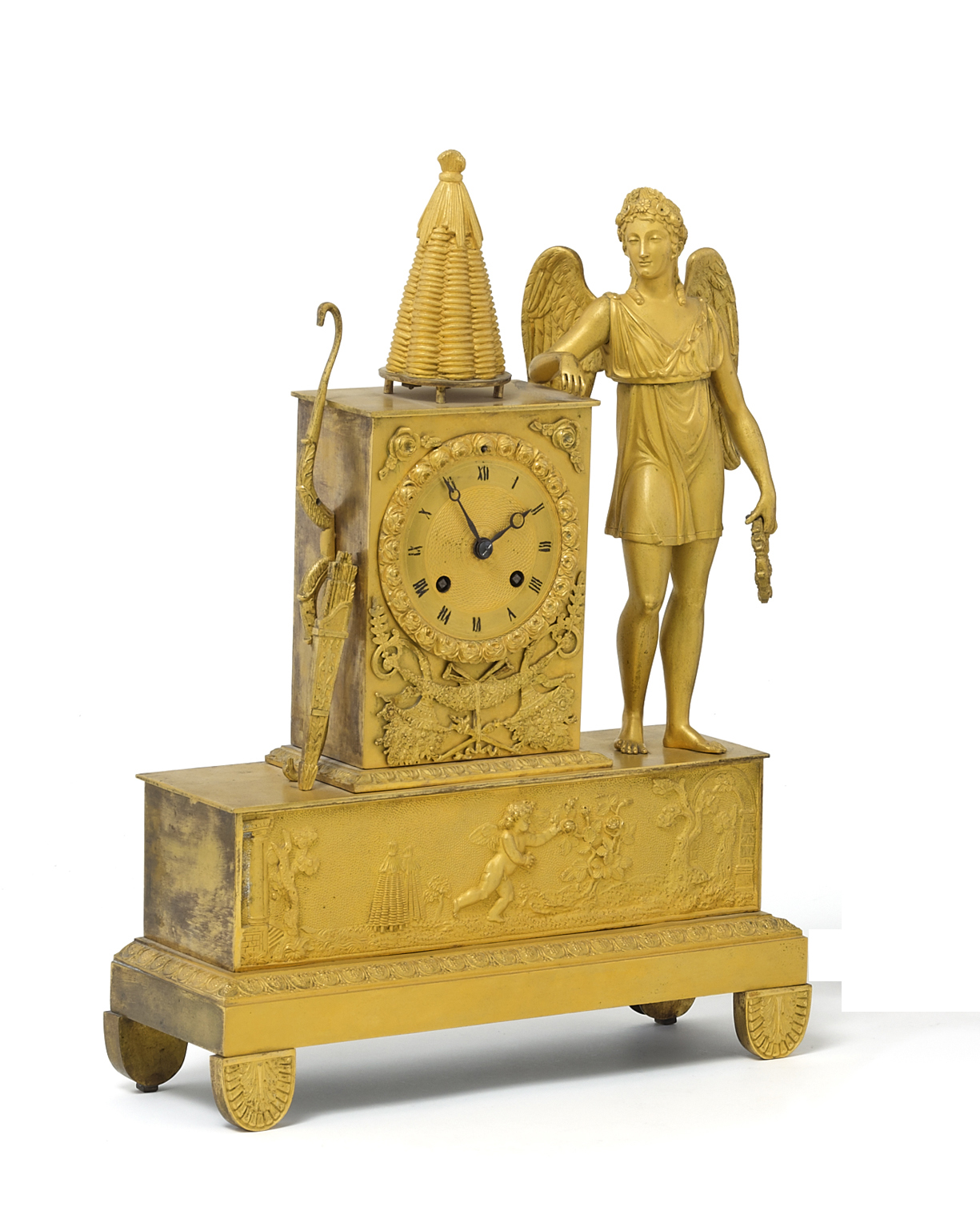 Bronze vergoldet. Hoher Sockel, im Fries Amor als Honigdieb. Stehender Amor an hochrechteckiges Gehäuse