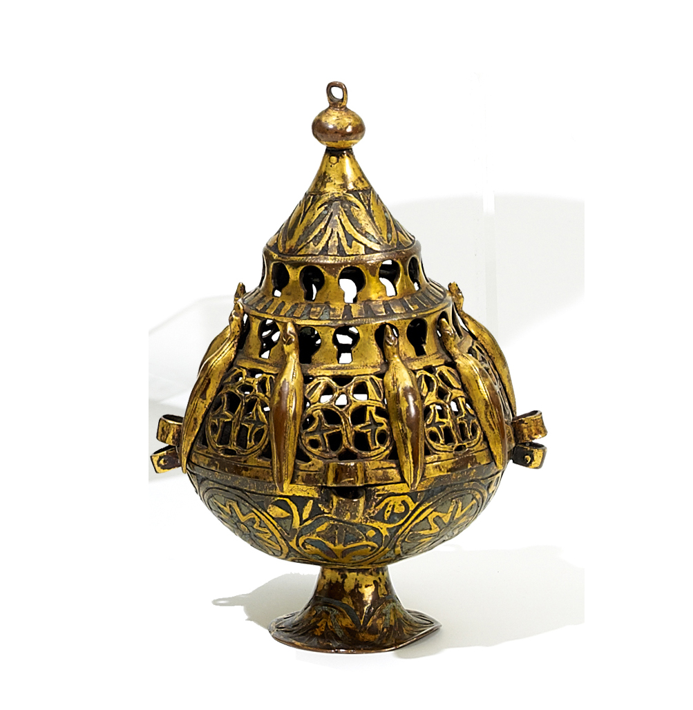 Kupfer vergoldet. Reste farbigen Emails. Runder gekehlter Fuß. Darauf kelchförmige Unterschale. Deckel in Form einer durchbrochenen