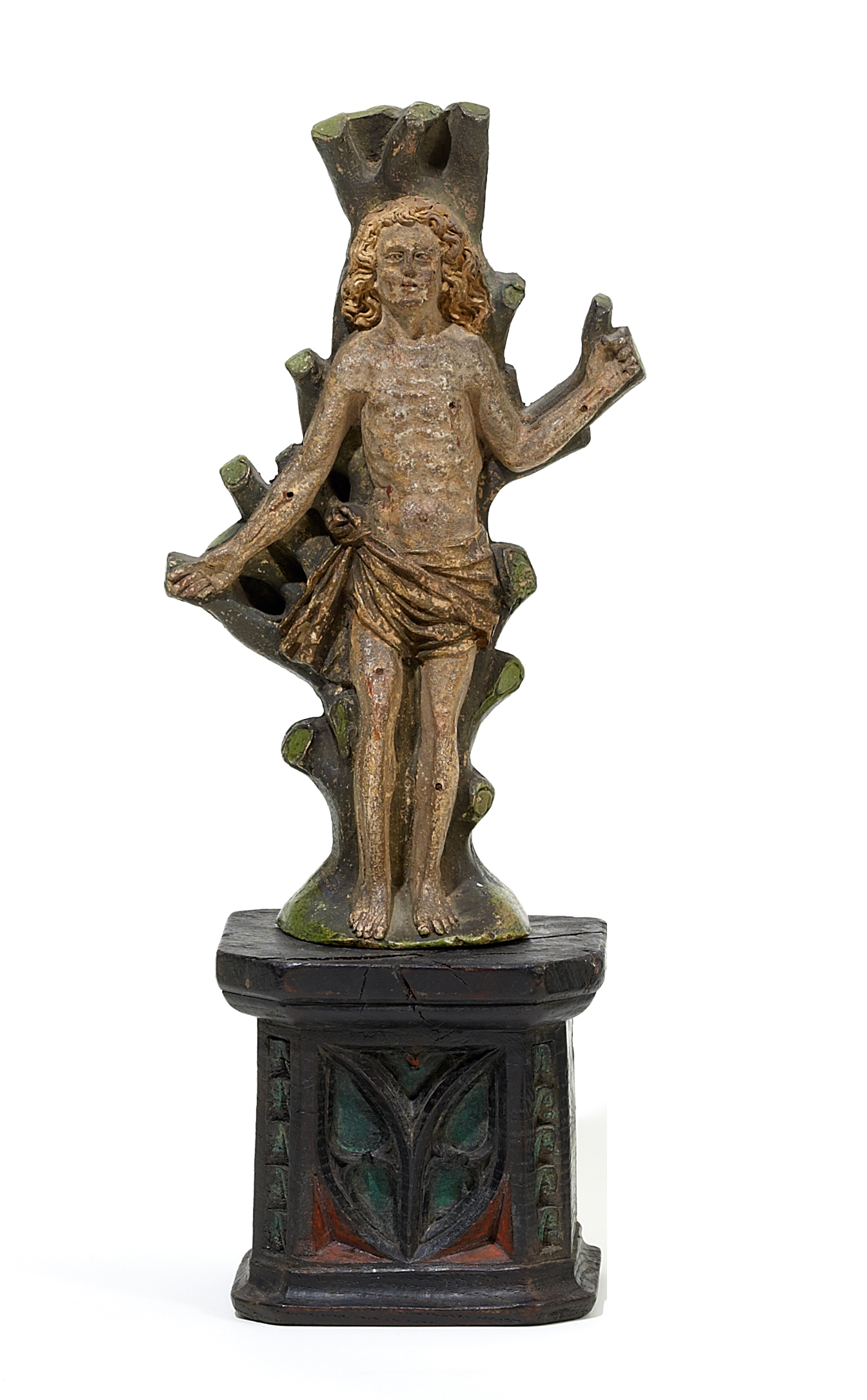 Gebrannter Ton mit polychromer Fassung. Geschnitzter gotischer Holzsockel mit Resten polychromer Fassung. Höhe mit Sockel 39 cm. Zustand B.