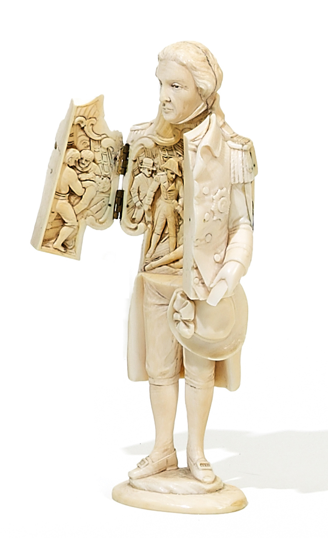 Elfenbein geschnitzt. Standfigur des Admirals mit aufklappbarer Brust. Innen drei Schiffsszenen, den Tod Nelsons