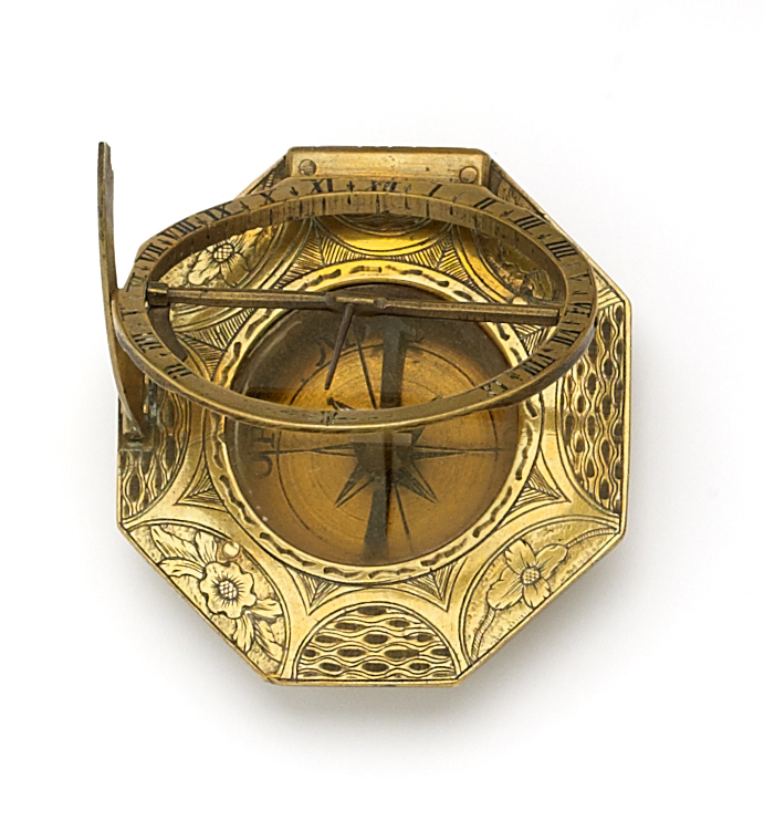 Messing graviert. Oktogonale Grundplatte mit eingelassenem Kompass. + 5,5 cm. Zustand B.