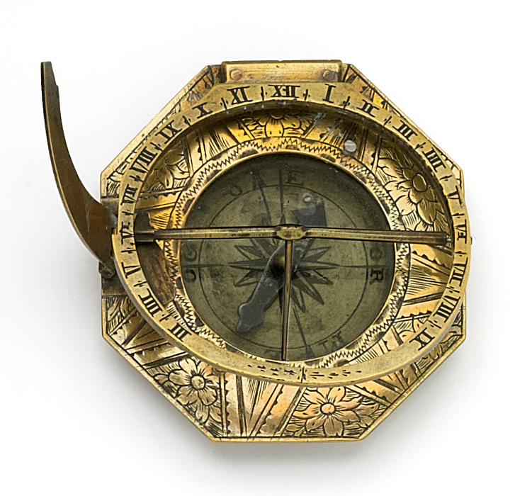 Messing graviert. Oktogonale Grundplatte mit eingelassenem Kompass. + 6 cm. Zustand B/C.
