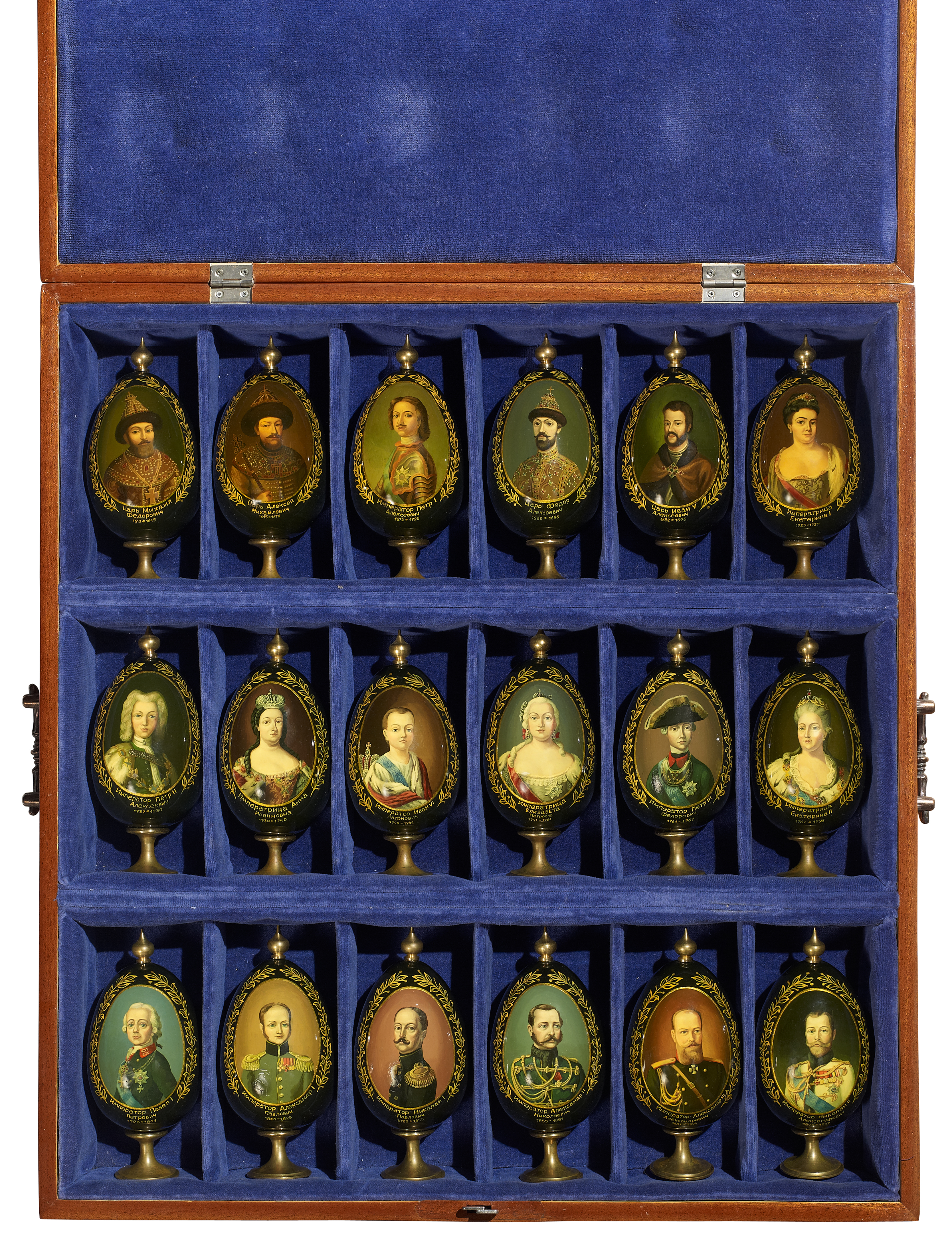 FOLGE VON ACHTZEHN OSTEREIERN MIT ZARENPORTRAITS IN HOLZKASTEN