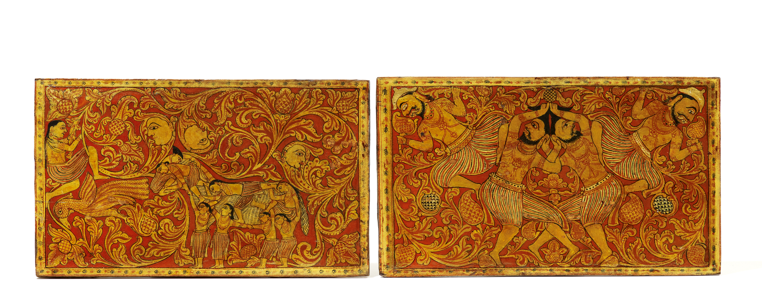 Holz mit farbiger Malerei. Zwischen Rankenwerk mit Figuren, Vögeln und grotesken figürliche Darstellungen. 19x32cm bzw. 19x33 cm.