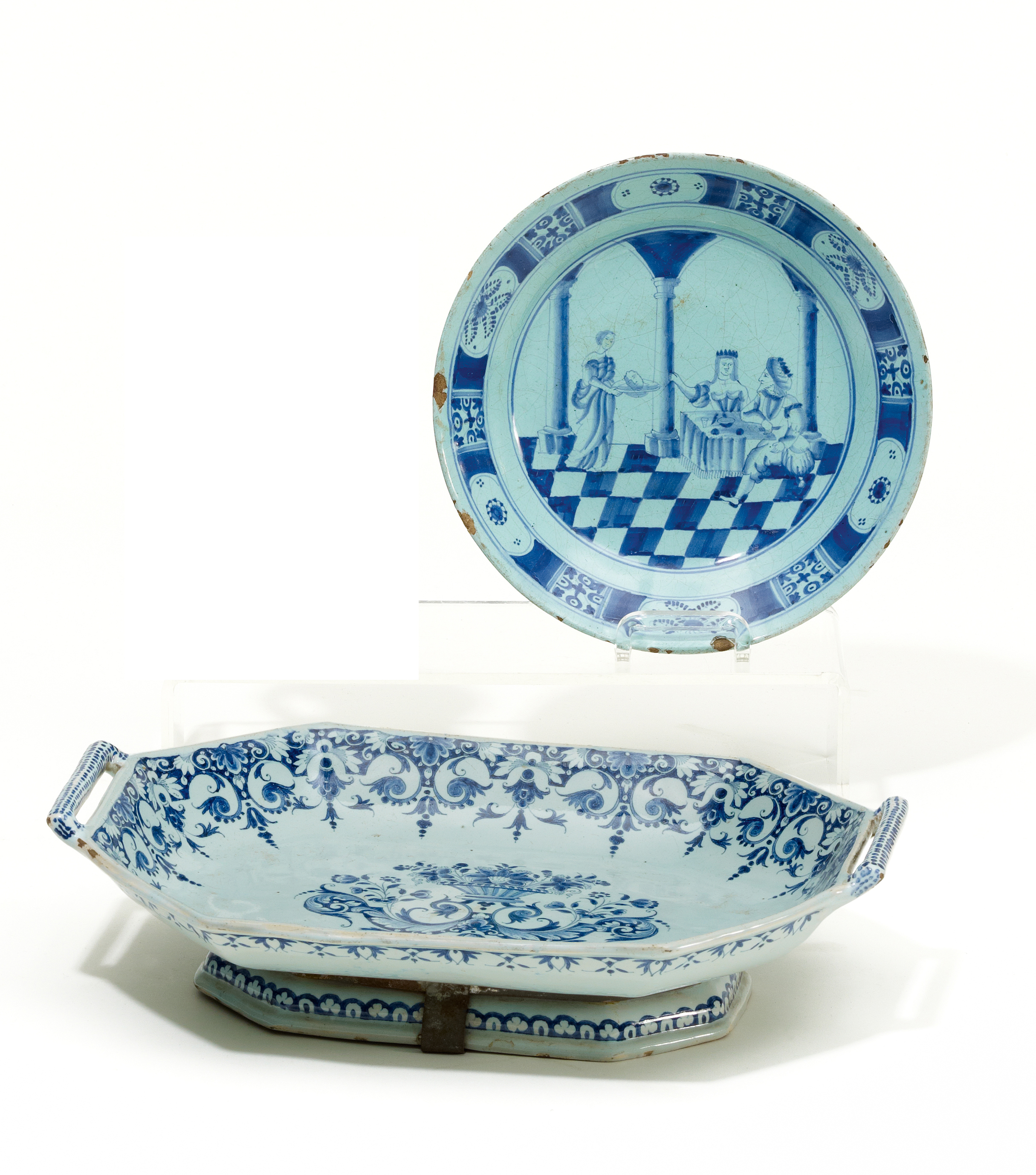 Bräunlicher Scherben mit kleisterblauer Glasur und dunkelblauem Dekor. Metallmontierung für Aufhängung. {Beil.:} Kleiner Teller mit Salome und dem Täuferkopf. Hanau. Möglicherweise Johann Caspar