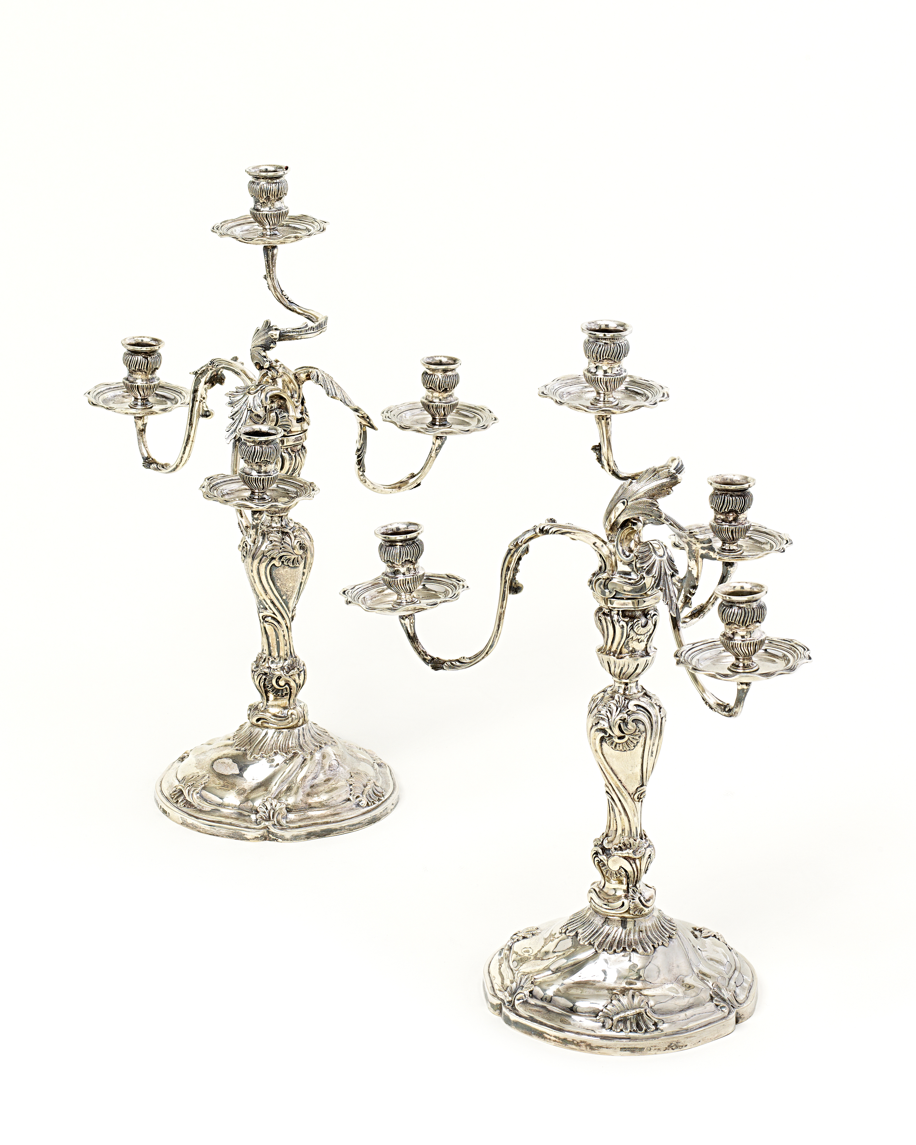 Fuß: a) Beschau Berlin 1869/1882 (Scheffler, Berlin Nr.16), 2. Zeichenmeister (ebd. Nr.22), 13 Lot. b) 13 Lot. Girandolenaufsätze ohne erkennbare Marken. Beide ohne erkennbare Meistermarke. Zustand A/B.