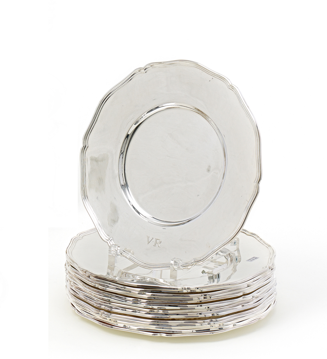 Silber. Passiger, profilierter Rand. Jeweils mit Monogramm VR. Ca. 7000g. ø 27cm.