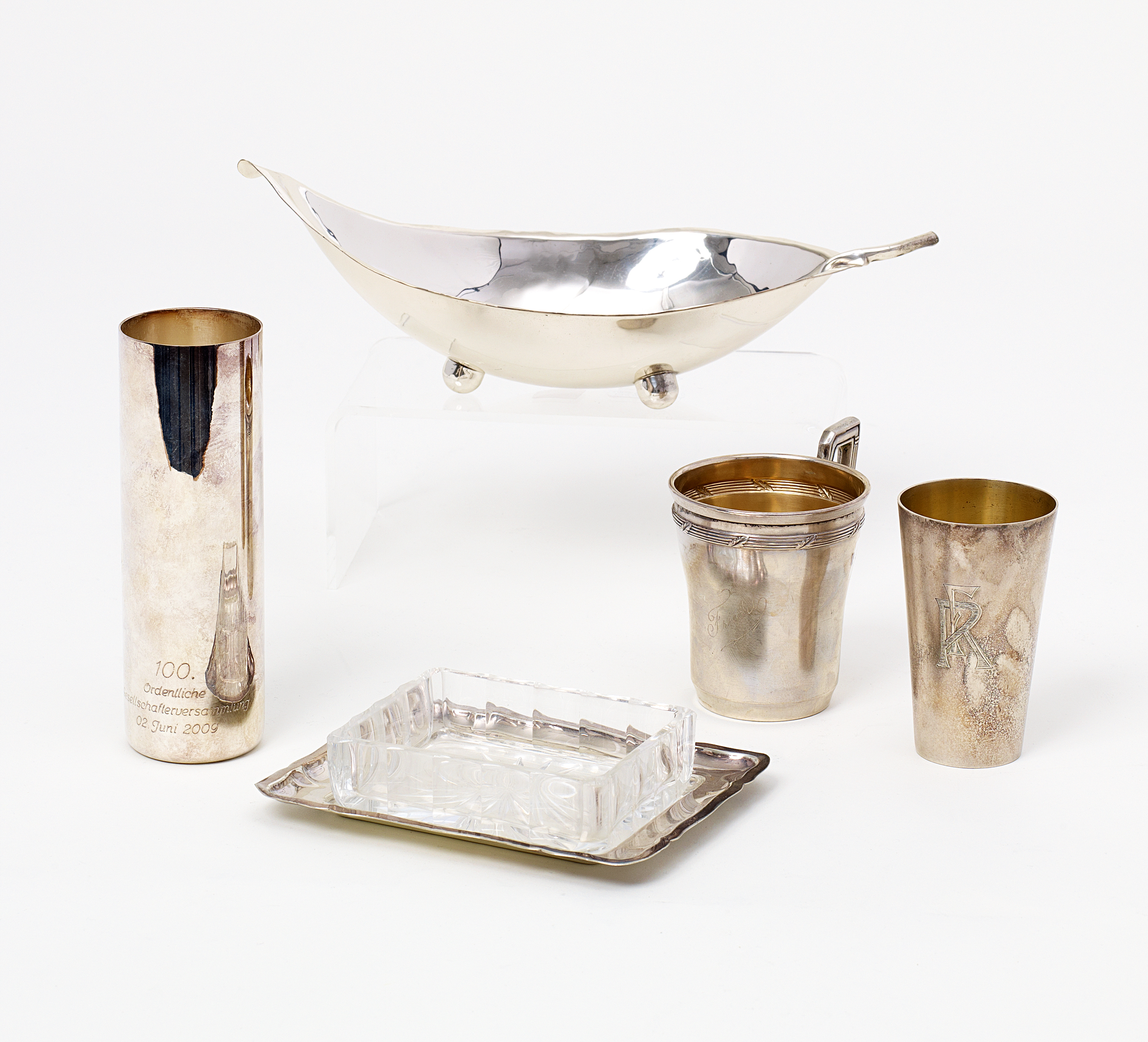 Silber. Einmal Glasschälchen. Ca. 652g. H.9, L.27,5/H.15/9,5/9/14,5x12cm.