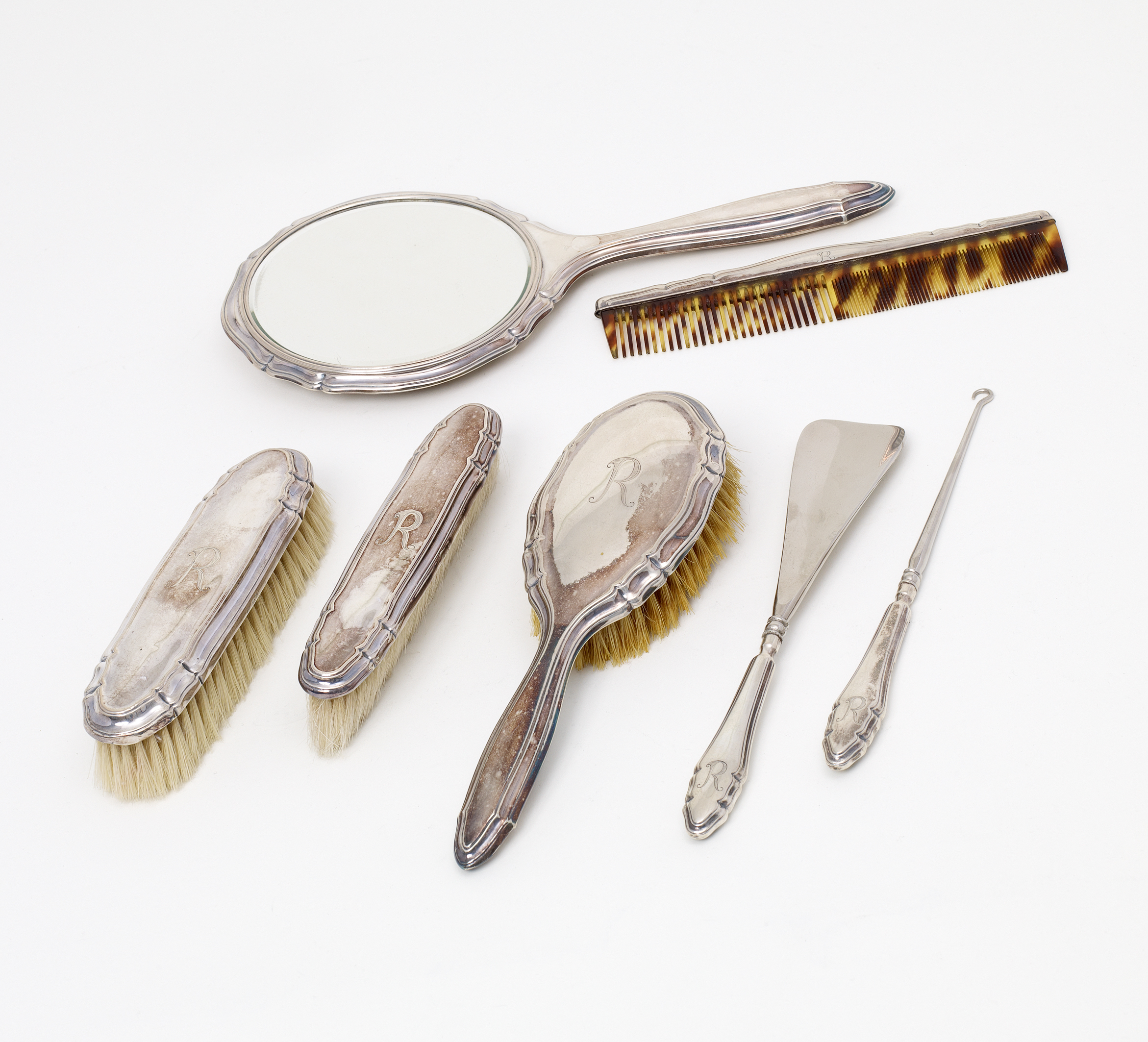 Silber. Jeweils mit Monogramm R. Bestehend aus: Handspiegel, Kamm, Haarbürste, zwei