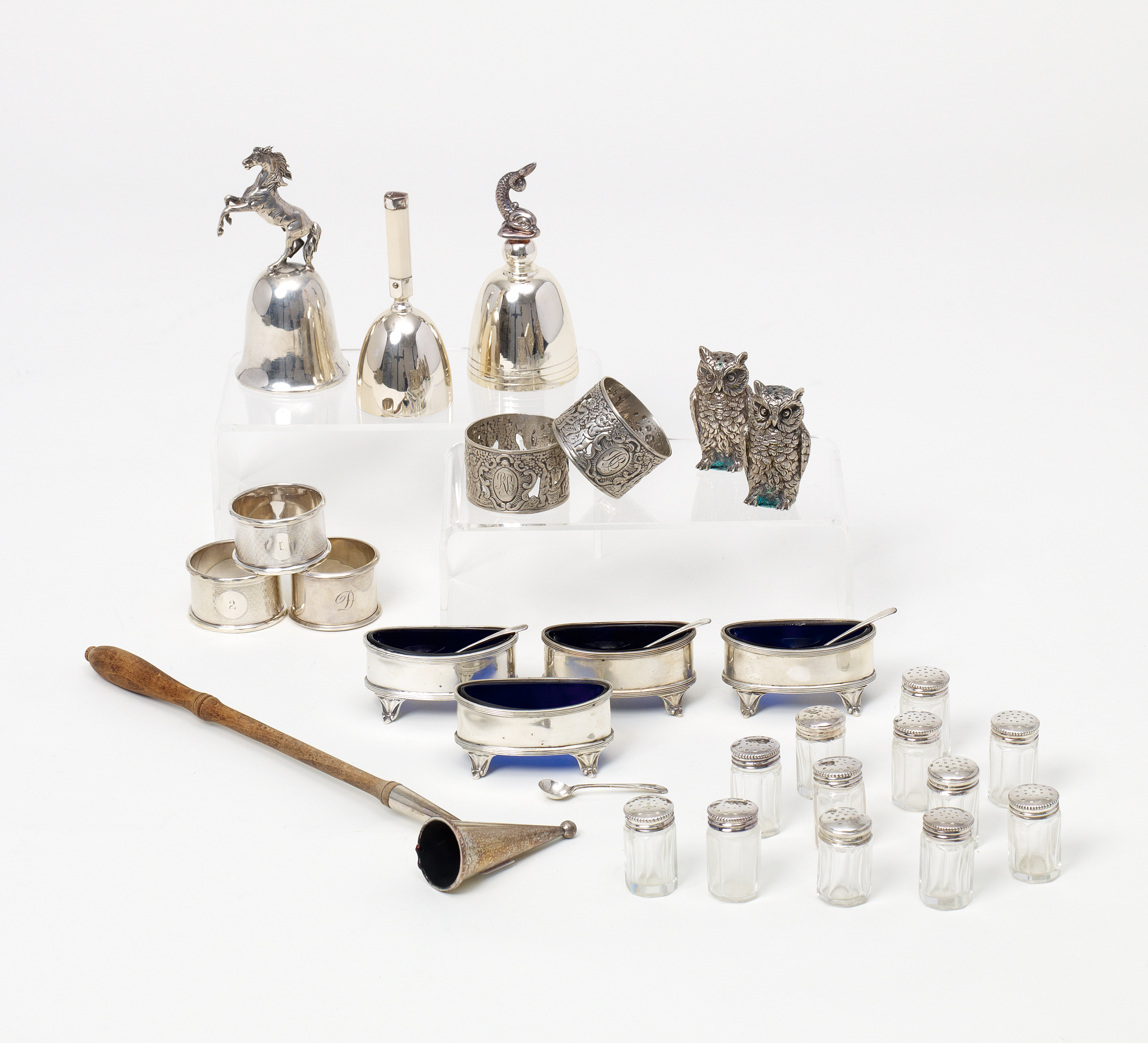 Silber. 5 Serviettenringe, 3 Handglocken, 12 Salzstreuer, 2 Eulenstreuer, 4 Salieren mit blauem