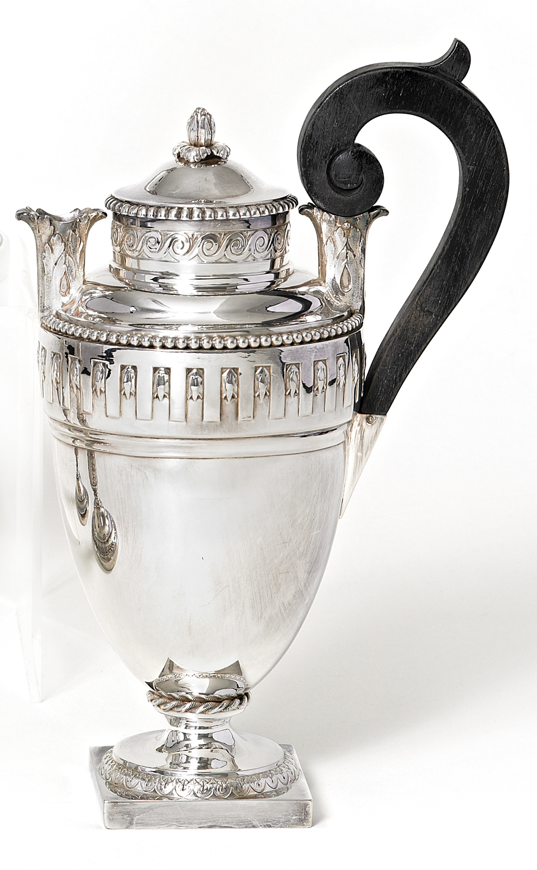 Silber. Ebonisierter Holzhenkel. Flache, rechteckige Plinthe mit leicht ansteigendem Rundfuß. Schlanker ovoider Korpus mit