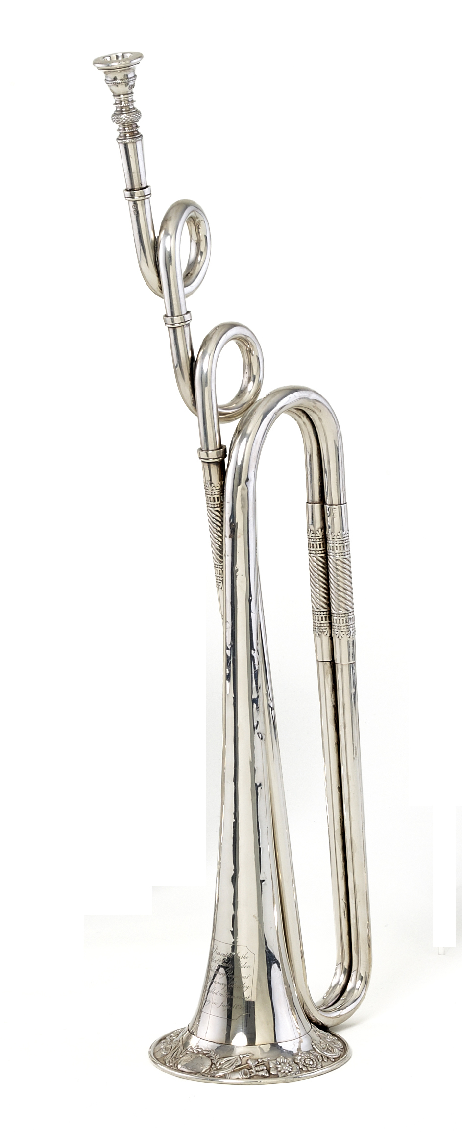 Silber. Vorne auf dem Schallbecher gravierte Widmung: 'Presented by the Rt. Honble Lady Arden to