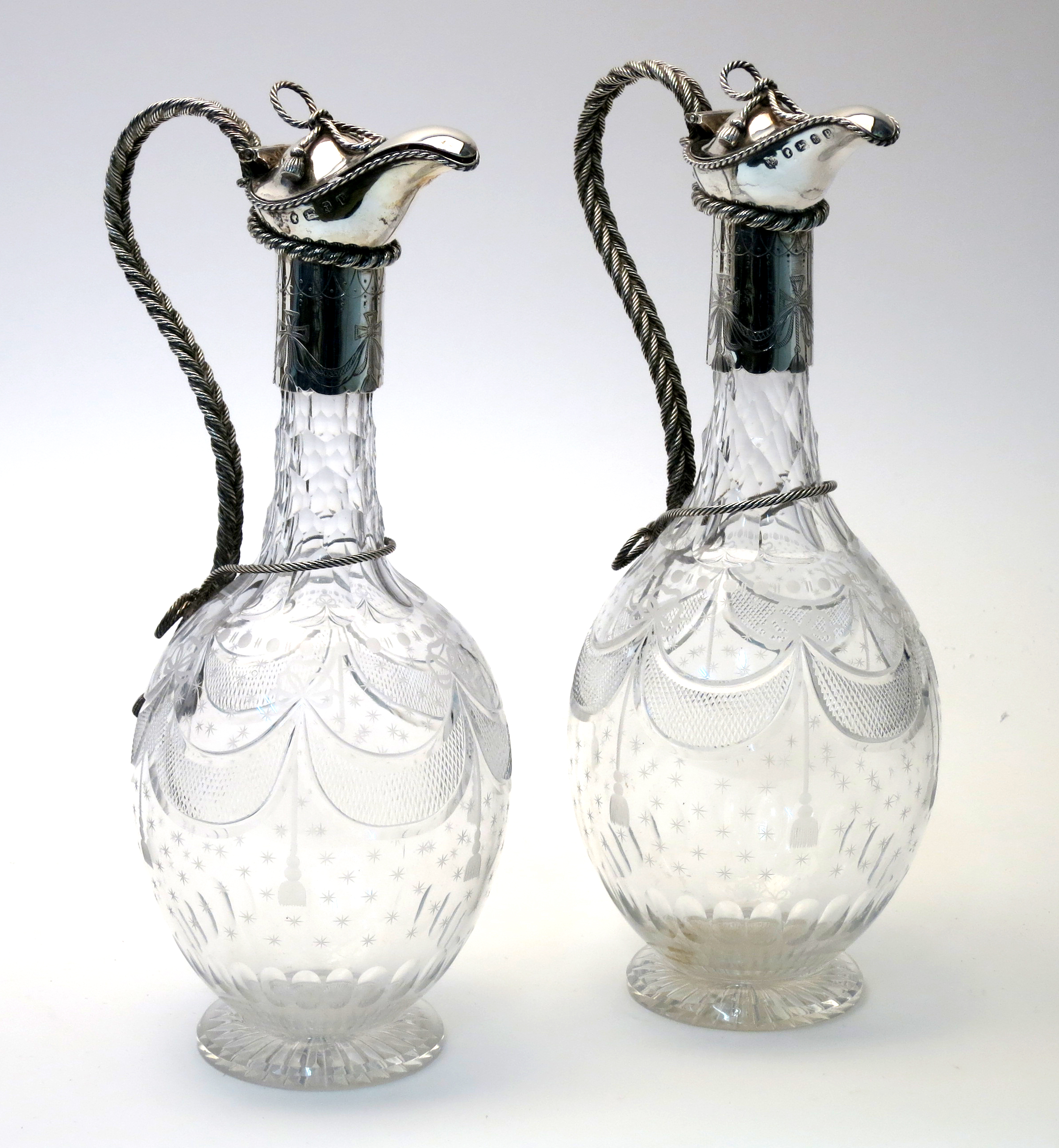 graviert. Silbermontierung mit Trompe l'oeil Henkel als geflochtene Kordel gearbeitet. Höhe je 30,5cm.