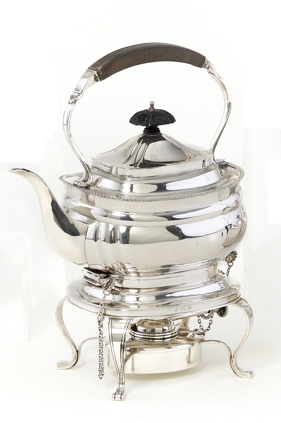 Silber. Ebenholzhenkel und -knauf. Ca. 1110g. Höhe (bei aufgestelltem Henkel) 28cm.